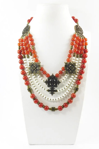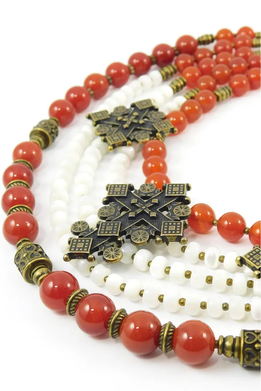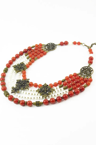 Ошатне намисто в традиційному стилі з калиново-червоного сердоліку (кривавця) та біло-перлинного перламутру з металевими намистинами та підвісками-зґардами під бронзу, котре прикрасить образу будь-якої панянки. Виріб складається з намистин різного розміру та форми, котрі гармонійно доповнюють одна одну. Прикраса стане гарним подарунком до будь-якого свята та вдало доповнить як образ в стилі етно, так і додасть особливого шарму класичному діловому.