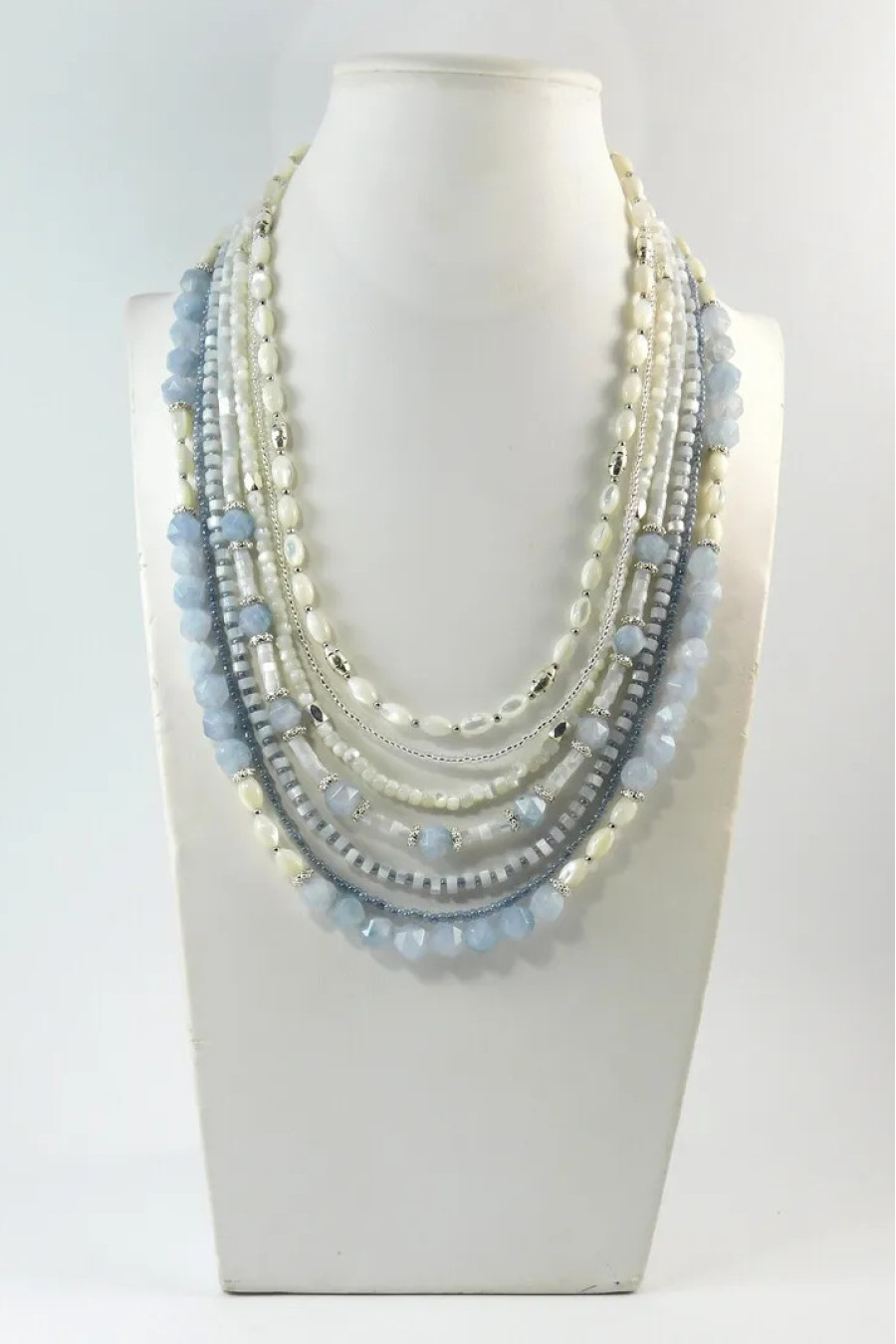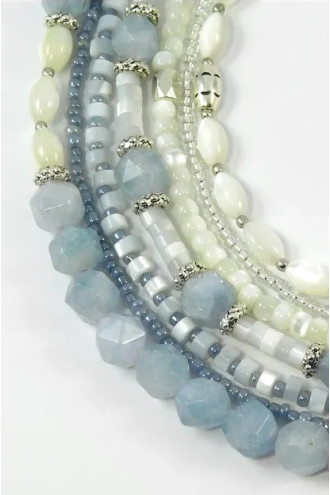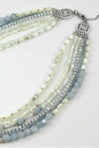 Семирядне комбіноване намисто з льодянисто-блакитного аквамарину, перламутрових намистин та бісеру в молочній та сірій гамі, котре додасть образу ніжності та романтичності Прикраса доповнить образ, додасть йому урочистості та чарівності. Намисто стане гарним подарунком до будь-якого свята та вдало доповнить як образ в стилі етно, так і додасть особливого шарму класичному діловому.