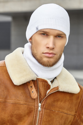 В'язаний комплект зі змішаної білої пряжі, котрий прикрасить демісезонний та зимовий гардероб стильного джентльмена. Модель складається з класичної шапки з підкладкою з мікрофлісу, широкою резинкою та шарфу-хомут, котрий зігріє горло в будь-які морози. Комплект подарує відчуття затишку та підійде до різноманітних варіантів верхнього одягу.