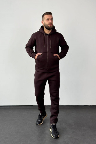 Комфортний спортивний костюм «Базаніт» шоколадного кольору виготовлений із трикотажу тринитки на флісі. Завдяки цьому він теплий, м’який, довго зберігає яскравість кольору та гладку фактуру. Комплект складається із кофти та штанів. Кофта застібається на блискавку, має капюшон із шнурками-затяжками. Має широкі накладні кишені, в які вміщується чимало дрібничок. Рукав втачний зі спущеним плечем та широкою манжетою. Штани пошиті зі звуженням ногавиць до низу з фіксацією на манжету-гумку. Для зручності в них передбачені глибокі внутрішні кишені у бічних швах.