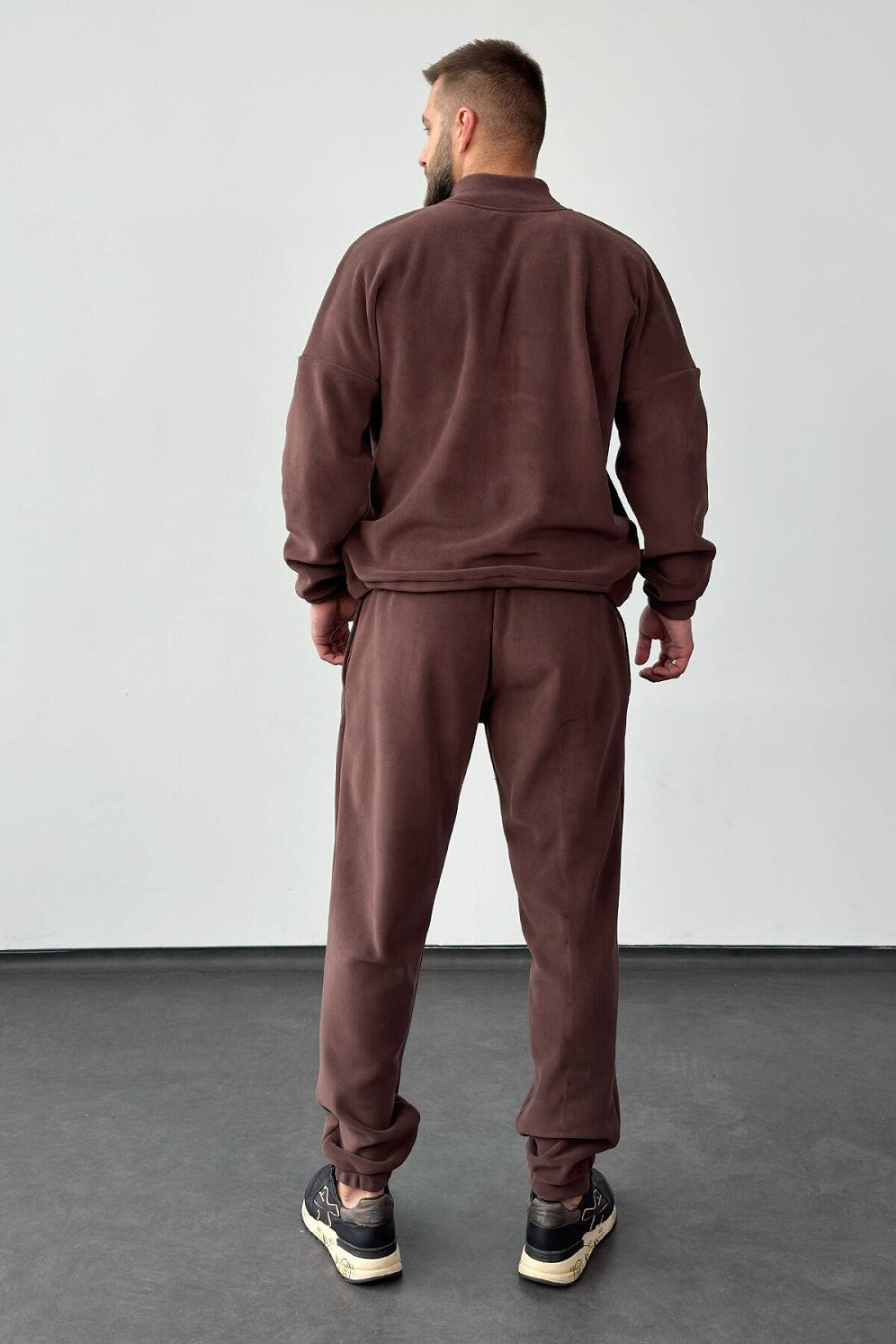 Спортивний комплект «Бекхенд» коричневого кольору виготовлений із двостороннього флісу. Має вільний крій та декілька оригінальних деталей. Перед світшоту скроєний з трьох частин у вигляді ромбу, в шви якого закладені кишені. Передбачена застібка-блискавка, що доходить до середини грудей. Рукав вільний зі спущеним плечем закінчується манжетою на резинці. У бічні шви штанів вільного крою закладені кишені на блискавці, як і в світшоті. Штани фіксуються на стегнах поясом-гумкою. Внизу ногавиці звужені за рахунок невисоких манжетів.