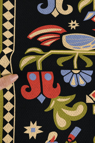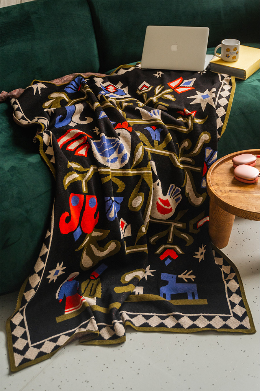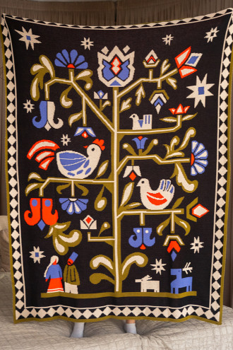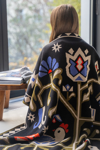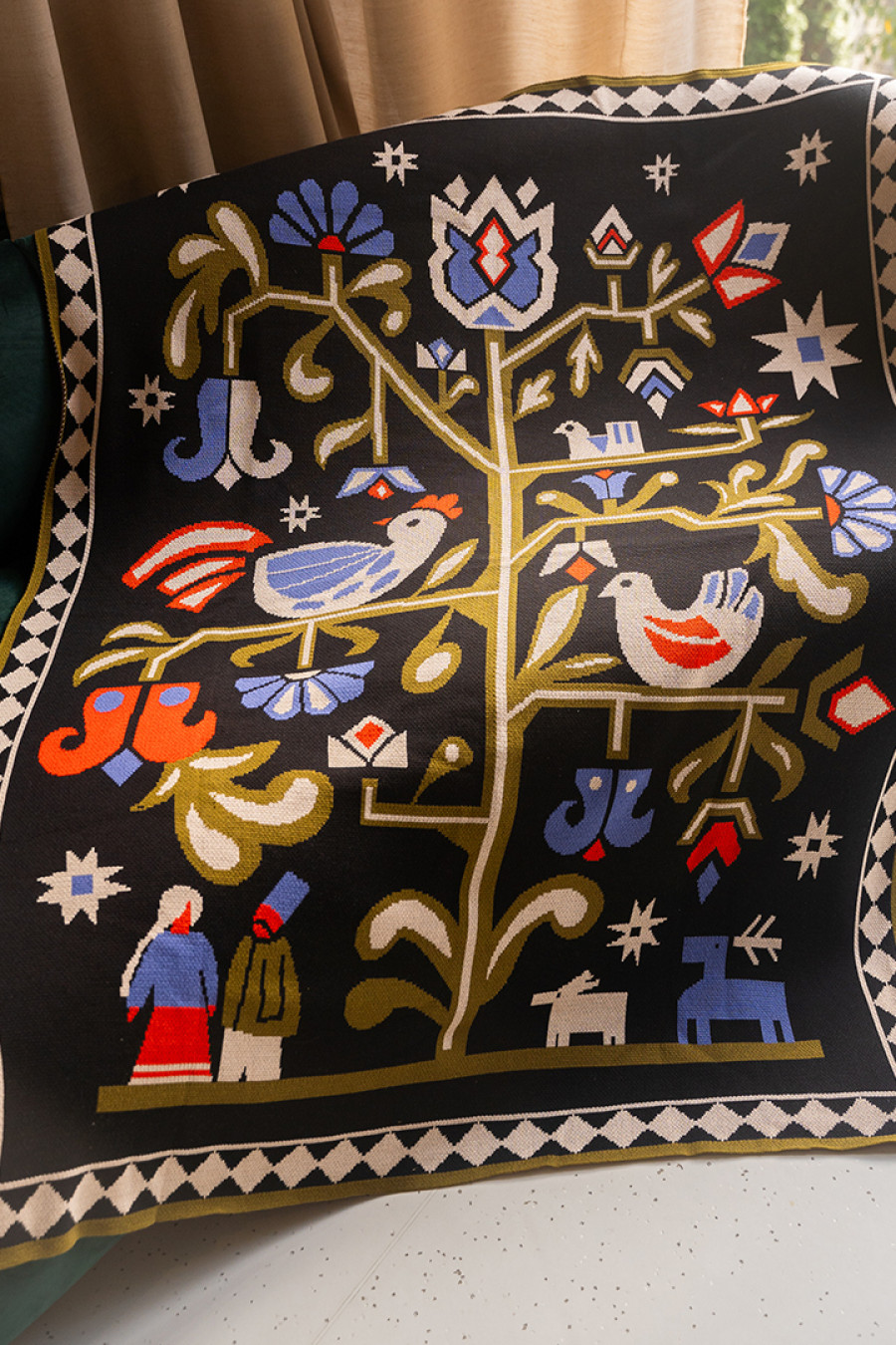 Затишний чорний в'язаний плед зі змішаної бавовняно-акрилової пряжі з контрастним барвистим узором: стилізоване дерево життя, сімейна пара, тварини, пташечки та геометричні орнаменти. Виріб додасть інтер'єру вишуканості та етнічності, подарує приємне відчуття "батьківського дому" навіть якщо ви за тисячі кілометрів від рідних пенатів. У нього так зручно загорнутись і хоч на мить забути про негаразди та негоду за вікном. Плед стане вдалим подарунком до свят чи сувеніром для поціновувачів українських традицій.