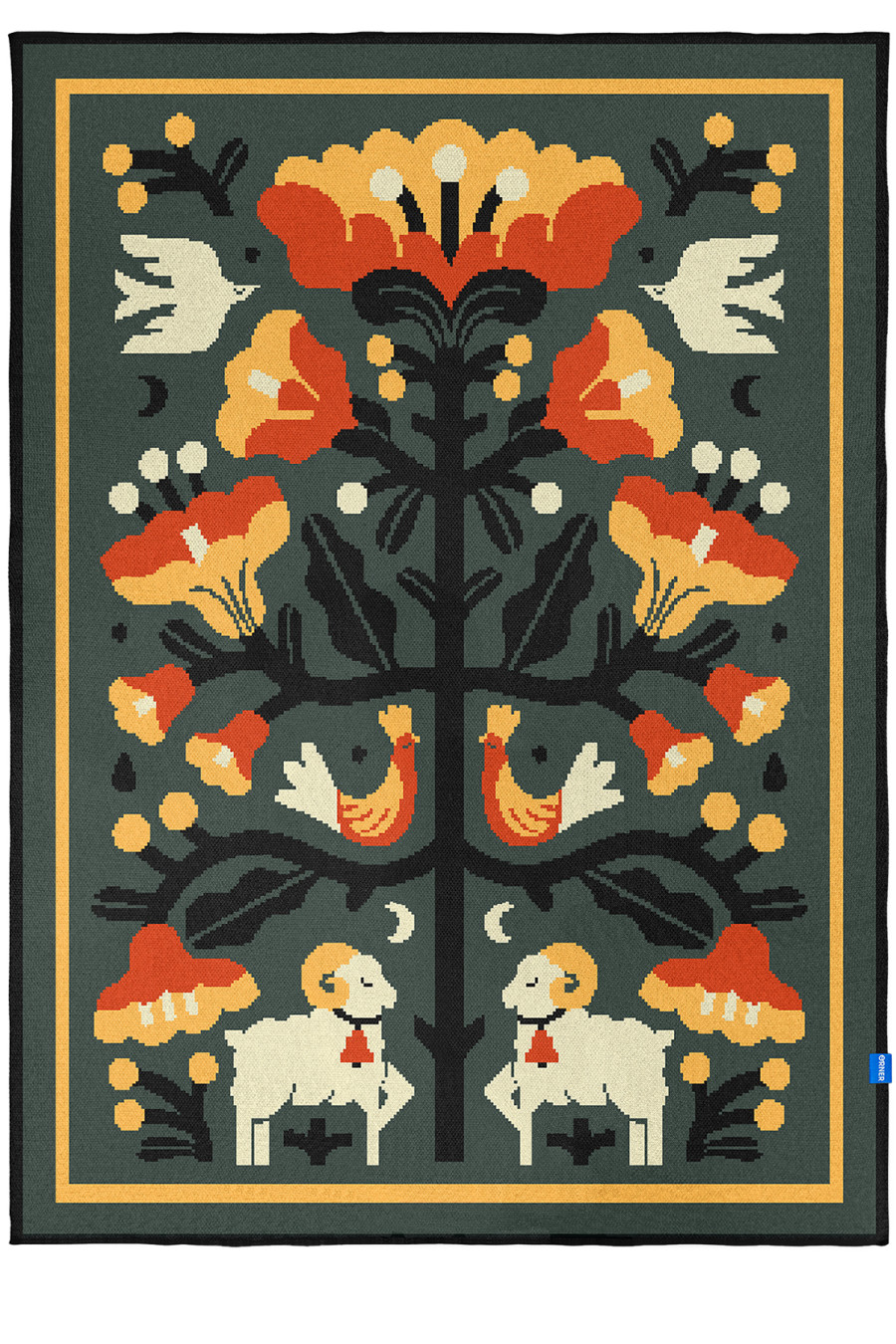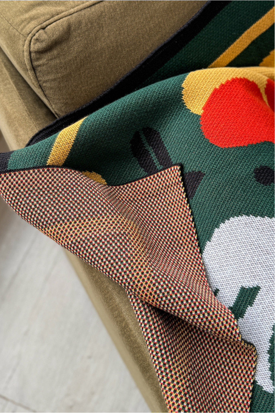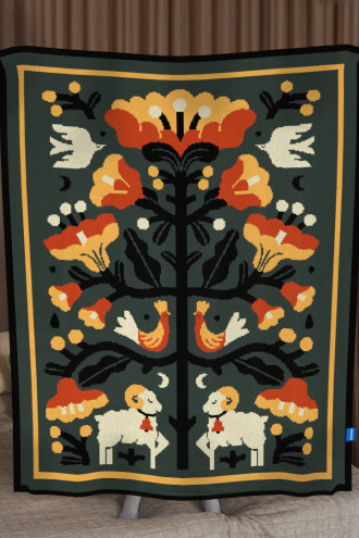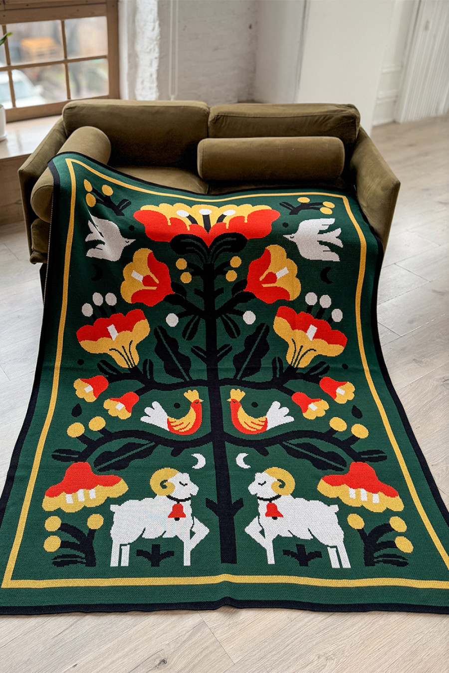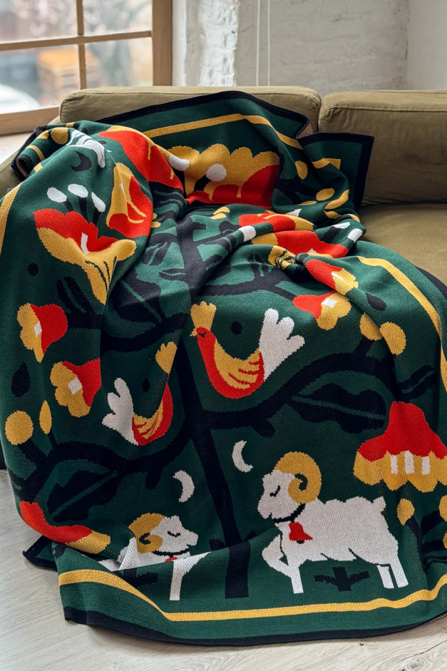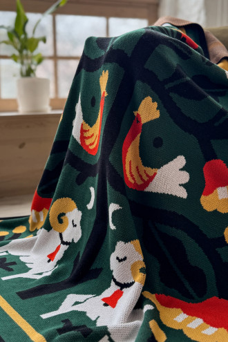 Темно-смарагдовий комфортний в'язаний плед зі змішаної бавовняної пряжі з контрастним барвистим орнаментом-узором: дерево життя, що символізує вічний цикл, з тваринами та пташками. Виріб додасть інтер'єру вишуканості та етнічності, подарує приємне відчуття "батьківського дому" навіть якщо ви за тисячі кілометрів від рідних пенатів. У нього так зручно загорнутись і хоч на мить забути про негаразди та негоду за вікном. Плед стане вдалим подарунком до свят чи сувеніром для поціновувачів українських традицій.