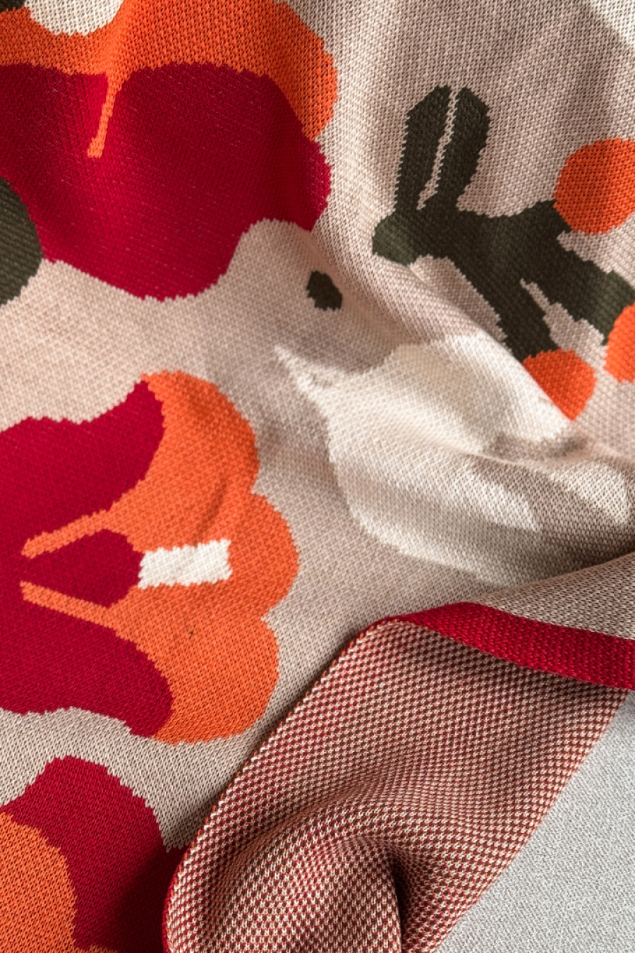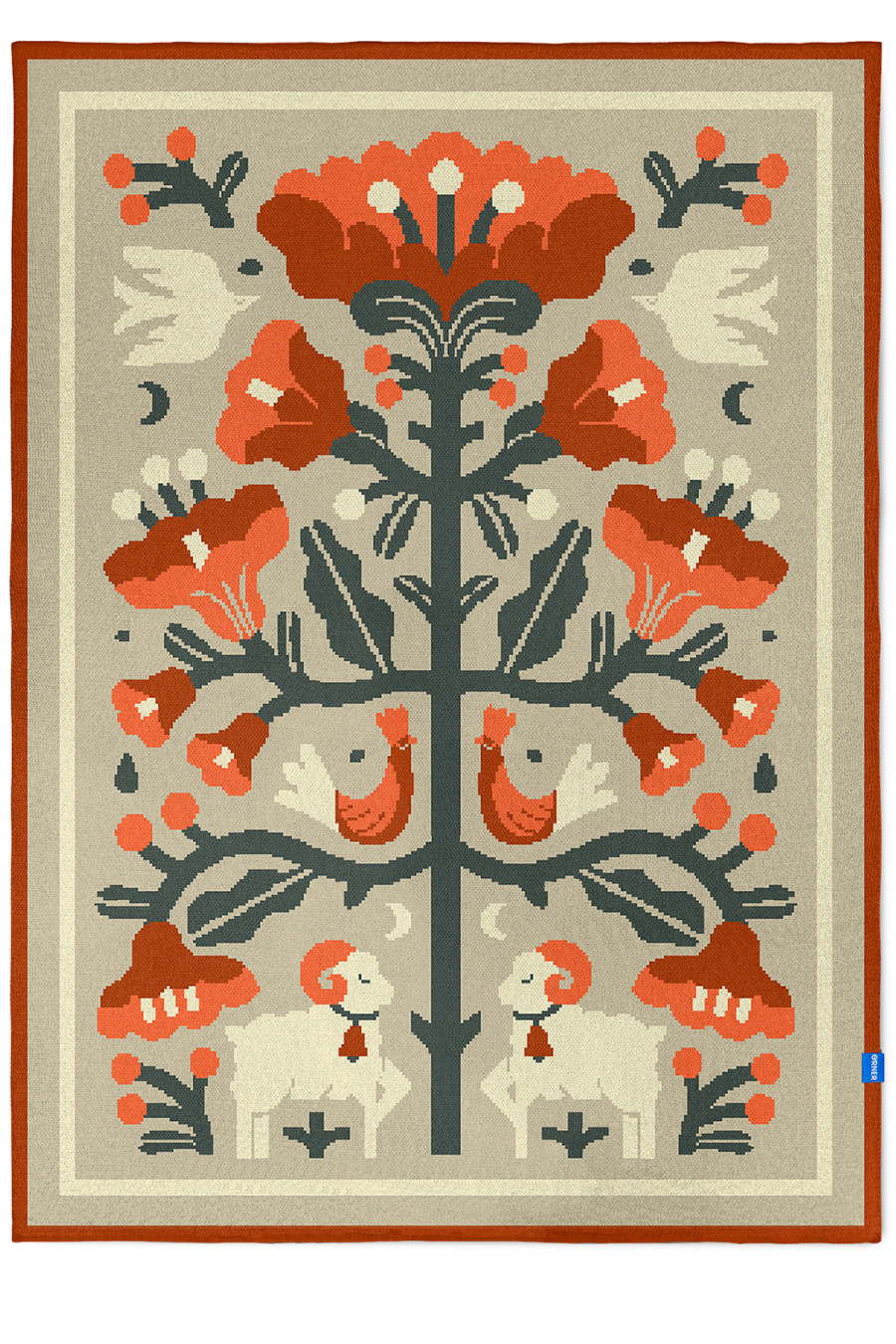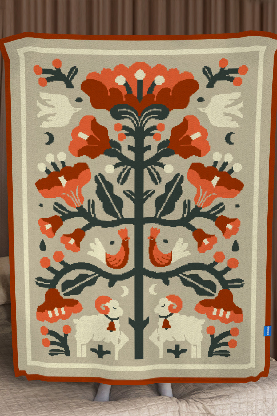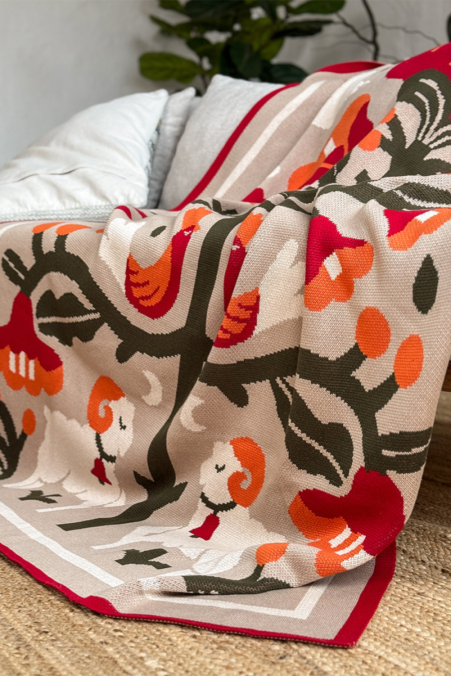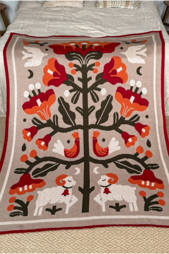 Затишний сіро-бежевий в'язаний плед зі змішаної бавовняної пряжі з барвистим орнаментом-узором: дерево життя, що символізує вічний цикл, з тваринами та пташками. Виріб додасть інтер'єру вишуканості та етнічності, подарує приємне відчуття "батьківського дому" навіть якщо ви за тисячі кілометрів від рідних пенатів. У нього так зручно загорнутись і хоч на мить забути про негаразди та негоду за вікном. Плед стане вдалим подарунком до свят чи сувеніром для поціновувачів українських традицій.
