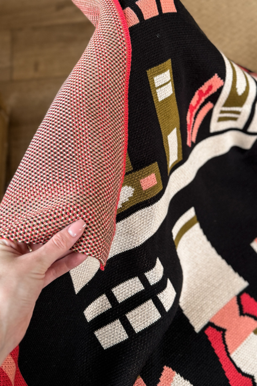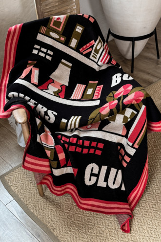 Оригінальни затишний в'язаний плед з приємної змішаної пряжі чорного кольору з контрастним узором, на котрому втілено мрію "залюбленої в читання" людини: книжкові полиці з примірниками та елементи декору. Виріб додасть інтер'єру вишуканості та етнічності, подарує приємне відчуття "батьківського дому" навіть якщо ви за тисячі кілометрів від рідних пенатів. У нього так зручно загорнутись і хоч на мить забути про негаразди та негоду за вікном. Плед стане вдалим подарунком до свят чи сувеніром для поціновувачів українських традицій.