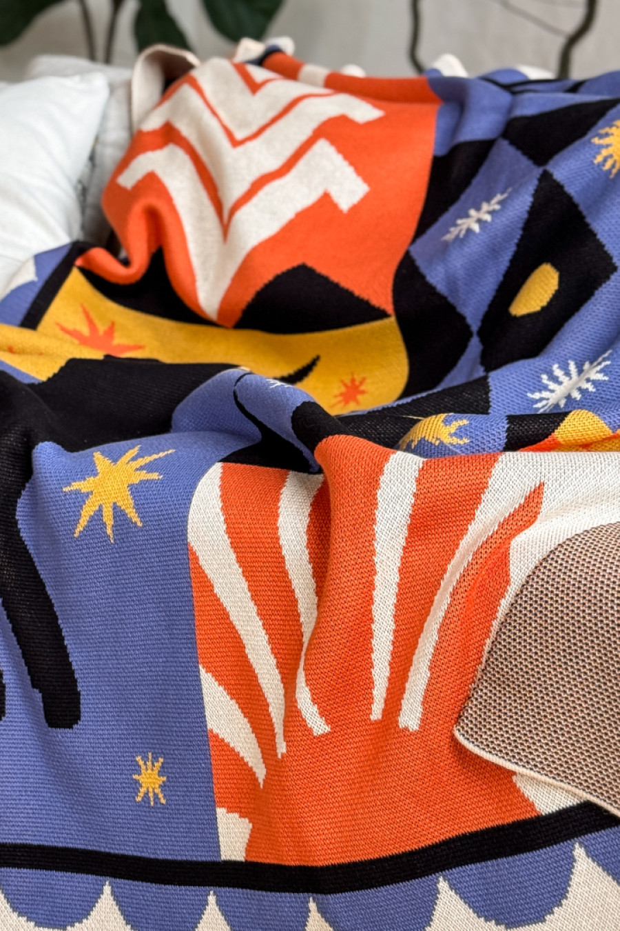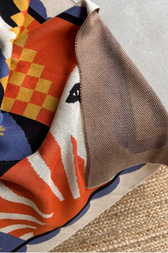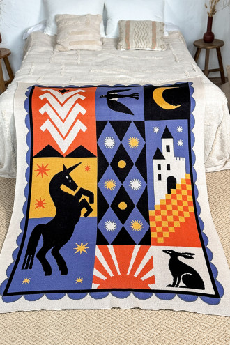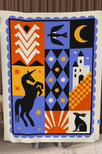 В'язаний плед зі змішаної пряжі волошково-блакитного кольору з узором: казкові істоти, замок та геометричні орнаменти, котрий подарує дивовижні кольорові сни. Виріб додасть інтер'єру вишуканості та етнічності, подарує приємне відчуття "батьківського дому" навіть якщо ви за тисячі кілометрів від рідних пенатів. У нього так зручно загорнутись і хоч на мить забути про негаразди та негоду за вікном. Плед стане вдалим подарунком до свят чи сувеніром для поціновувачів українських традицій.