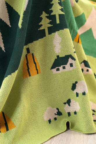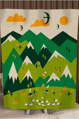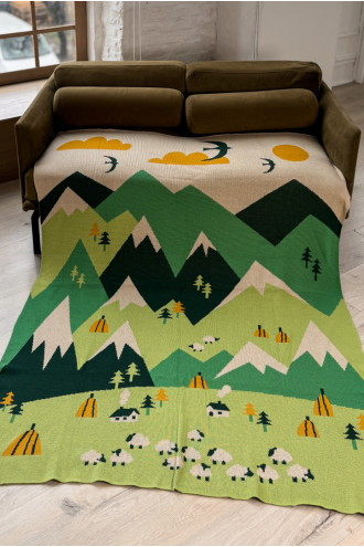 М'який теплий в'язаний плед зі змішаної пряжі світло-бежевого кольору з пасторальним узором-картиною: зелені Карпати зі сніжними шапками, вівчар з отарою та птахи, що вільно літають поміж хмар. Виріб додасть інтер'єру вишуканості та етнічності, подарує приємне відчуття "батьківського дому" навіть якщо ви за тисячі кілометрів від рідних пенатів. У нього так зручно загорнутись і хоч на мить забути про негаразди та негоду за вікном. Плед стане вдалим подарунком до свят чи сувеніром для поціновувачів українських традицій.