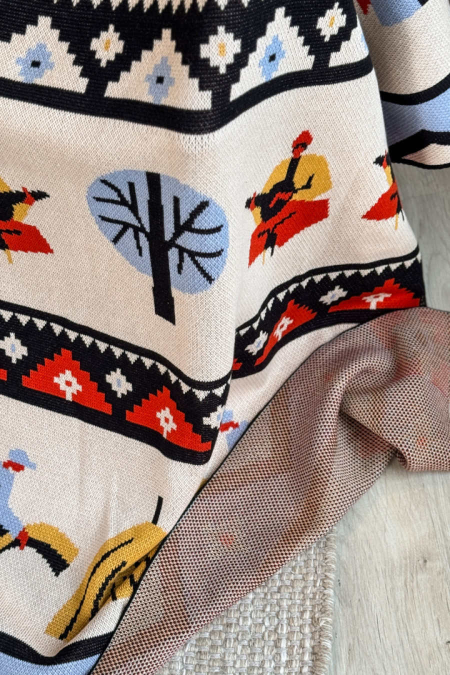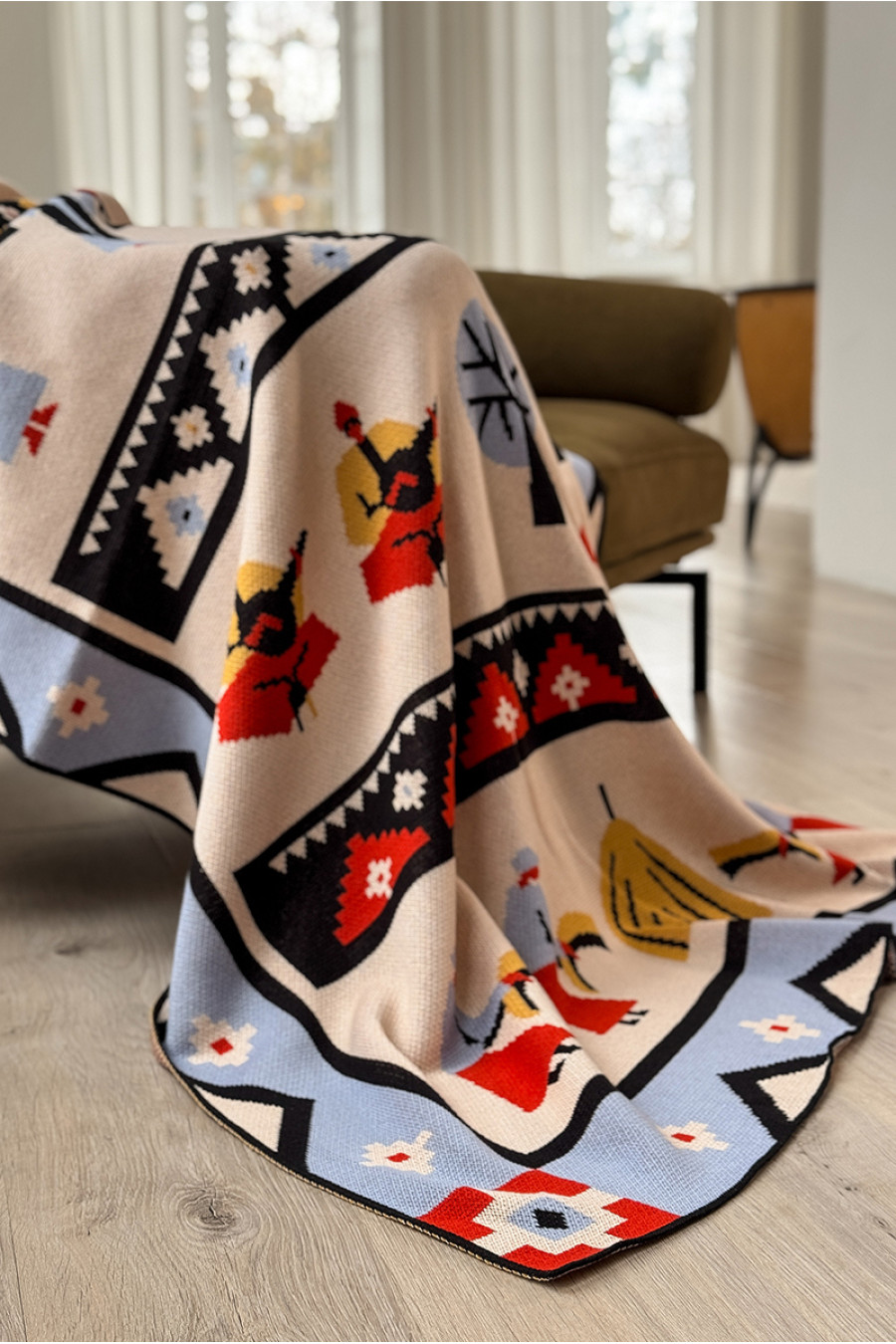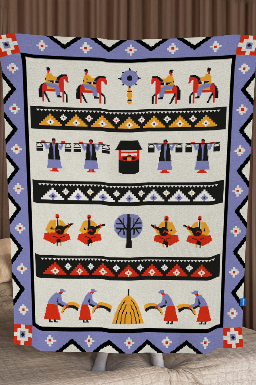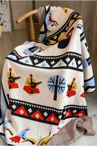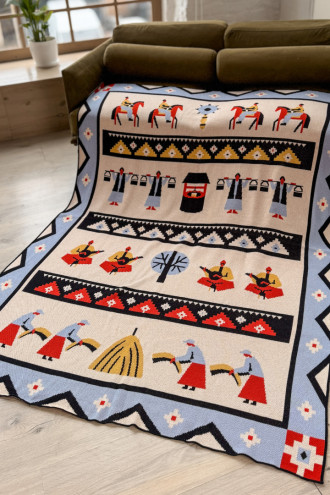 Теплий в'язаний плед зі змішаної пряжі кремово-білого кольору з узором-ребусом, в котрому "заховано" чотири пісні: про хлопця, що вирушив за Блакитну ріку, про дівчину Галинку, що несе на коромислі відра, про тяжкі думи та про трударів полів косарів. Виріб додасть інтер'єру вишуканості та етнічності, подарує приємне відчуття "батьківського дому" навіть якщо ви за тисячі кілометрів від рідних пенатів. У нього так зручно загорнутись і хоч на мить забути про негаразди та негоду за вікном. Плед стане вдалим подарунком до свят чи сувеніром для поціновувачів українських традицій.