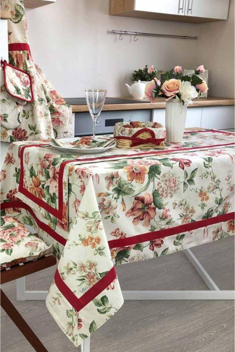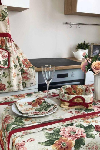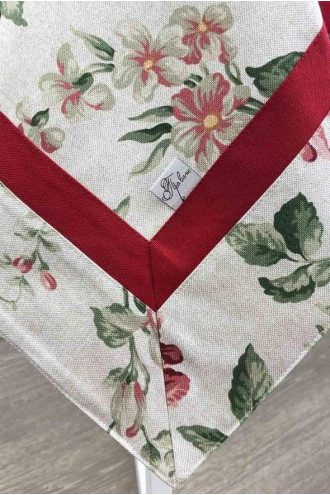 Бежево-лляна святкова скатертина на стіл із бавовняної тканини з пастельним малюнком-трояндами в бордово-зеленій гамі та бордово-винним широким кантом-стрічкою. Скатертина доповнить інтер'єр вашого дому, буде доречною і для тихого сімейного, і для урочистого застілля та гарно поєднується з різним посудом. Виріб може бути в декількох розмірних варіаціях та підійде і на невеличкий столик, і на великий обідній стіл для всієї родини. Вона стане гарним подарунком до свята для друзів та близьких.