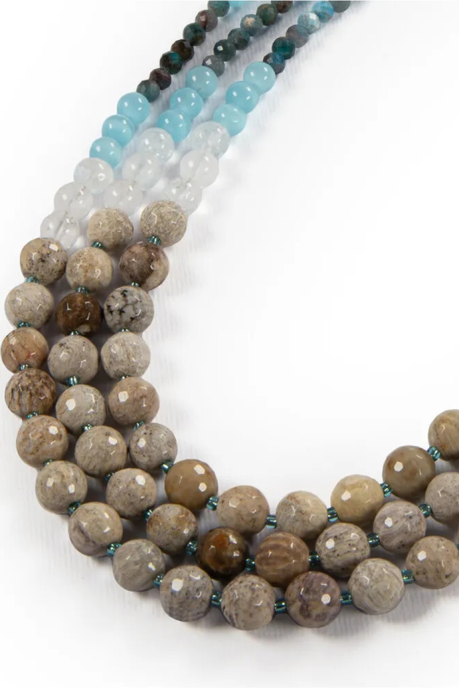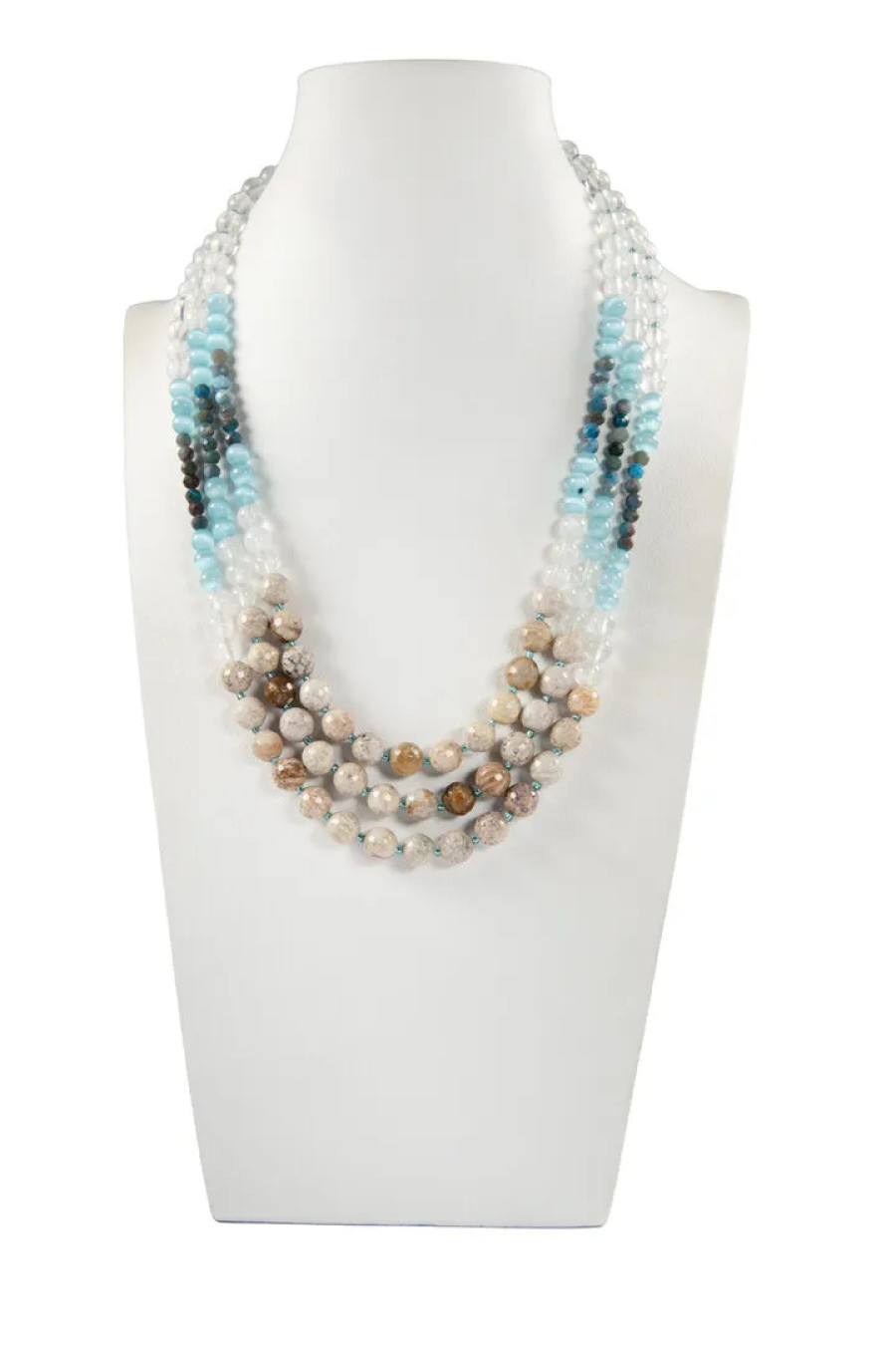 An elegant multi-colored necklace made of jasper, rock crystal, cat's eye and apatite, which embodies the colors of the sky over the steppes of Tavria. The product consists of beads of different sizes and shapes, which harmoniously complement each other. The decoration will be a good gift for any holiday and will successfully complement both an ethnic-style look and add a special charm to a classic business one.