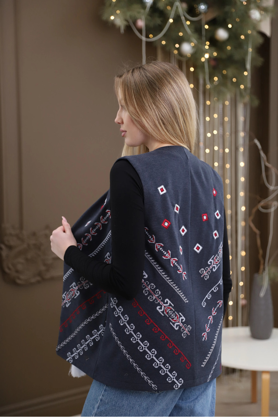 An exquisite women's vest in the Ukrainian style, made of fine cashmere, which makes it extremely soft and light, pleasant to the body. The model has a tie with white tassels, which add a playful accent to the product. The ornament extends throughout the product: in the upper part in the form of single diamonds, in the chest area and to the bottom on one side there is volumetric embroidery, on the other - a decorative motif in the form of stripes, the same on the back, but on both sides. The embroidery is made using the smooth technique, which emphasizes the accuracy and elegance of the product.