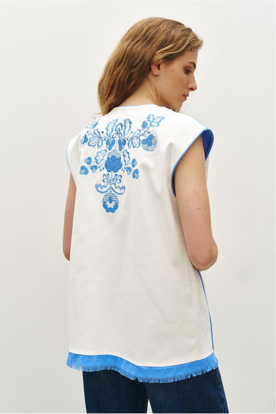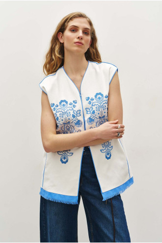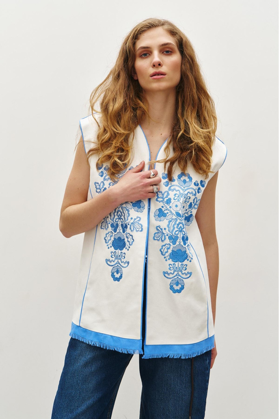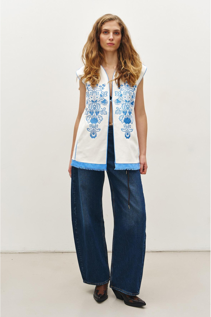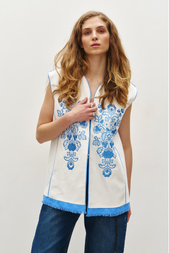 Charming milky-cream elongated embroidered vest made of denim and linen fabric with a blue-blue embroidered floral ornament and decor-braid and fringe. Free-cut model with a deep V-neckline, an elongated shoulder line, slit pockets at the hip level, figured seams with decor-braid, hidden hook-and-eye fasteners, fringe on the hem, lining, thin belt-lace made of eco-leather. The vest will emphasize the smoothness and fragility of the silhouette, will add sophistication to the image. The outfit will decorate the wardrobe of any young lady.