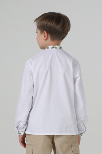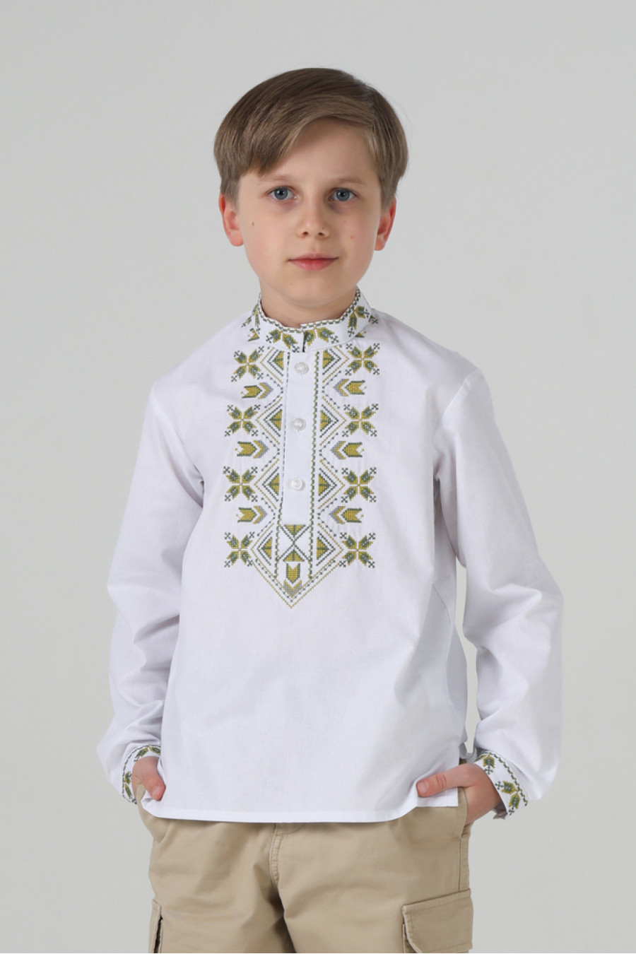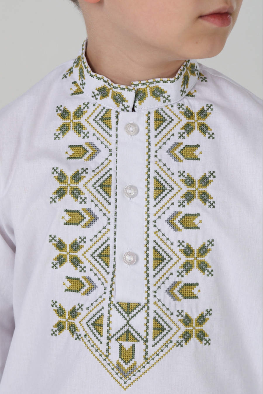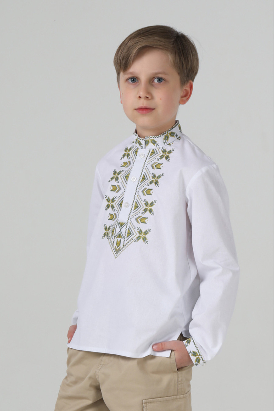 Embroidered shirt for a boy "Flowers of Life" in white with olive ornament