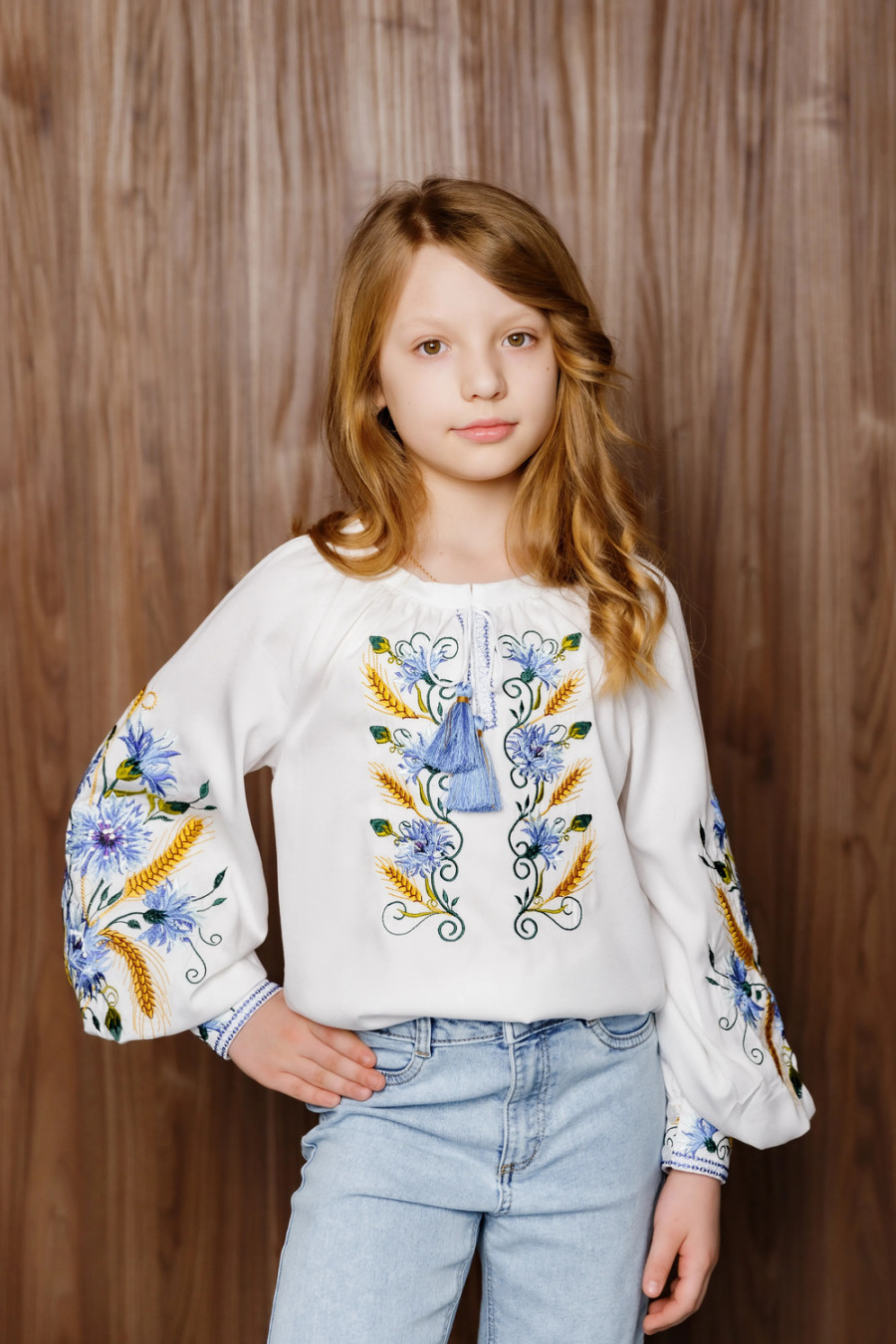 Snow-white embroidered dress for a girl made of shirt fabric with a colorful ornament-decor. A loose-fitting model with a wide rounded neck with gathers, a neckline with ties-tasiks on the shelf, spacious long raglan sleeves with high cuffs on the clasps. The shelf and sleeves are decorated with embroidered soft blue cornflowers and golden ears of wheat. The embroidery will add freshness and tenderness to the image, emphasize its beauty and fragility. The outfit will complement the little lady's wardrobe and will be appropriate for any event.