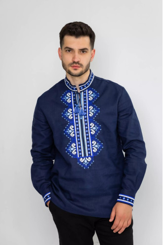 Elegant modern men's embroidered shirt made of natural mixed linen fabric in ink-blue color with contrasting embroidered decor. Loose-fitting model with stand-up collar, neckline with tassel ties, dropped shoulder line, long spacious sleeves with cuffs on the clasp. The collar, sleeve and cuffs are decorated with geometric ornament with a smooth surface in blue-blue and white-cream colors. The embroidered shirt will complement the men's wardrobe, add style and restraint to the image. The outfit can be combined with both a classic business suit and jeans.