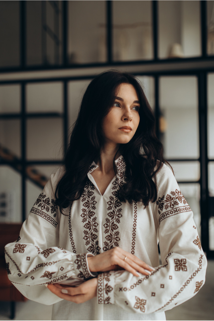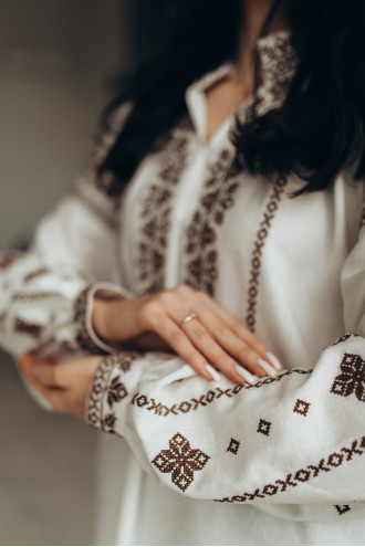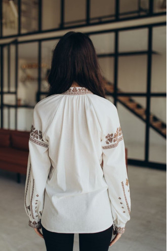Milk-cream women's embroidered shirt made of body-pleasing blended linen with an embroidered monochrome ornament-decor. Loose-fitting model with a small stand-up collar and gathers, a shallow neckline, lush long raglan sleeves with cuffs on the clasp, slits in the side seams. The shelf, collar and sleeves are decorated with a floral ornament and geometric cross-stitch in a coffee-chocolate range. The embroidery will add tenderness and playfulness to the festive image, emphasize the slimness and femininity of the figure. The outfit will be a good solution for any event.