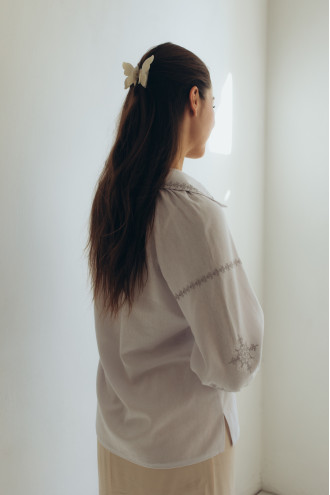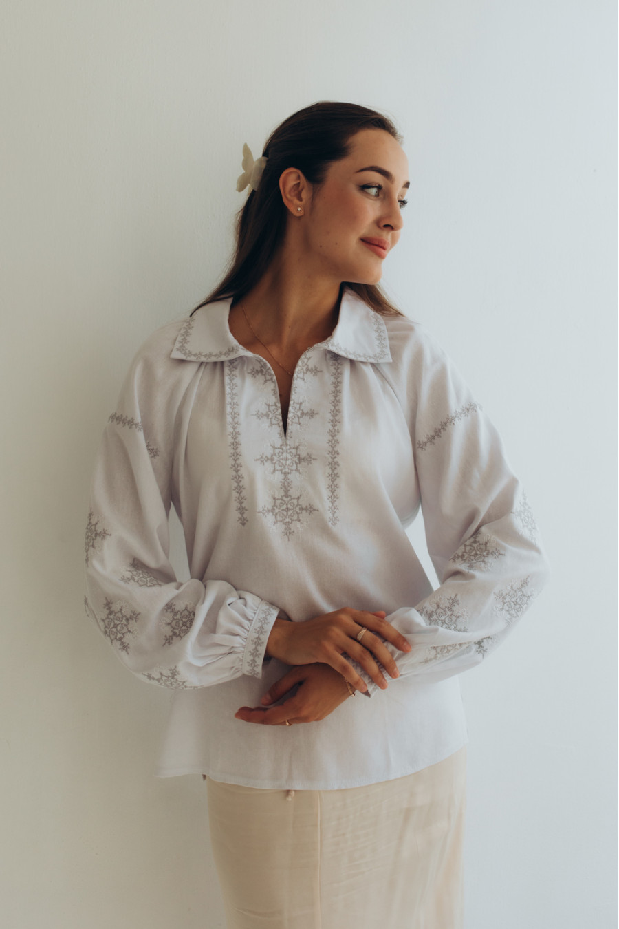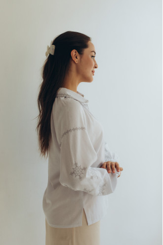 Charming women's embroidered shirt made of mixed linen in snow-white color with embroidered monochrome ornament-decor in pastel colors. Free-cut model with a stand-up collar, a shallow neckline, long spacious raglan sleeves with cuffs with a clasp, slits in the side seams. The sleeves and the shelf are decorated with a silver-gray frosty geometric ornament with a cross, the collar and cuffs with a knit. The embroidered shirt will decorate the wardrobe of any young lady, emphasize the fragility and femininity of the figure. The outfit goes well with both business trousers or a pencil skirt, and with jeans.