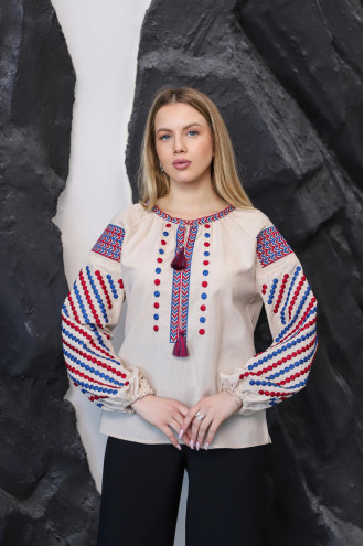 Exquisite traditional women's embroidered dress made of light beige, pleasant to the body, blended linen with contrasting embroidered ornament-decor. Loose silhouette model with a round neck, neckline with ties-knots, long spacious raglan sleeves with elastic cuffs, slits in the side seams. The shelf and sleeves of the dress are decorated with a blue-red ornament-knitted smooth fabric. The embroidery will complement the festive wardrobe of any fashionista, will add elegance and charm to the image. The dress will be a good option for both a festive office look and for a party and event in the ethno style.