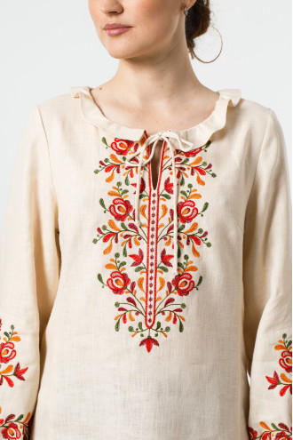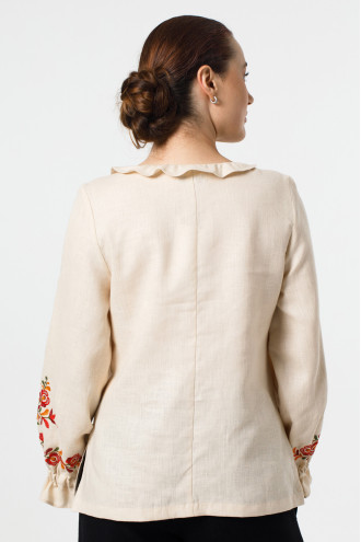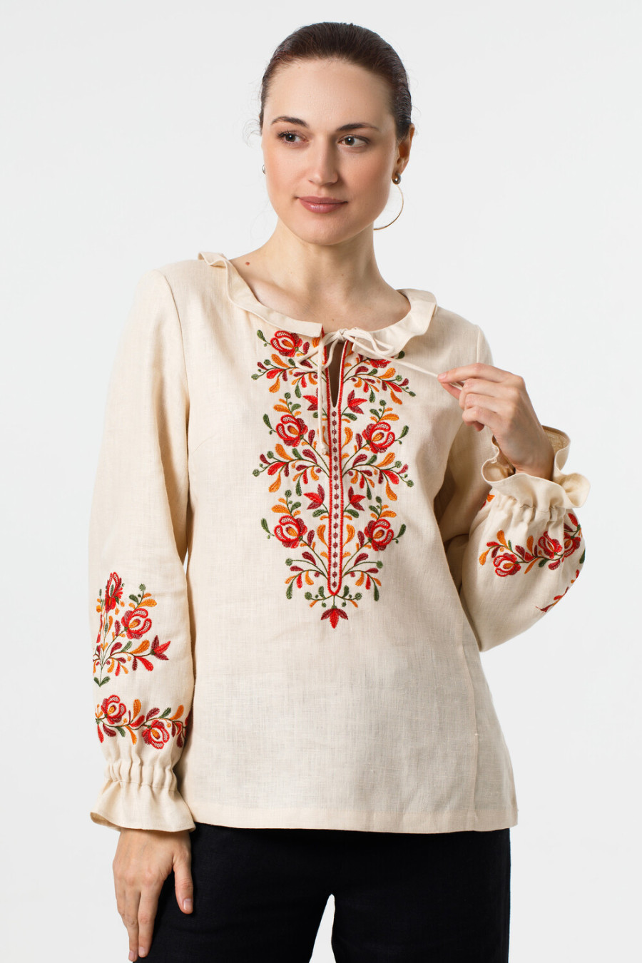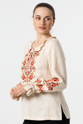 Light beige modern embroidered blouse made of pleasant to the touch thin linen with colorful embroidered ornament-decor. Model of semi-fitted cut with wide round neck with ruffle collar, neckline with ties on the shelf, spacious long sleeves with cuffs-flounces on elastic, chest indentations, slits in side seams. The shelf and sleeves are decorated with a floral ornament embroidered with a smooth finish in orange-red-olive tones. The embroidery will emphasize femininity and smoothness of forms, will add elegance and elegance to the girlish image. The outfit goes well with both office bottoms and jeans or linen pants.