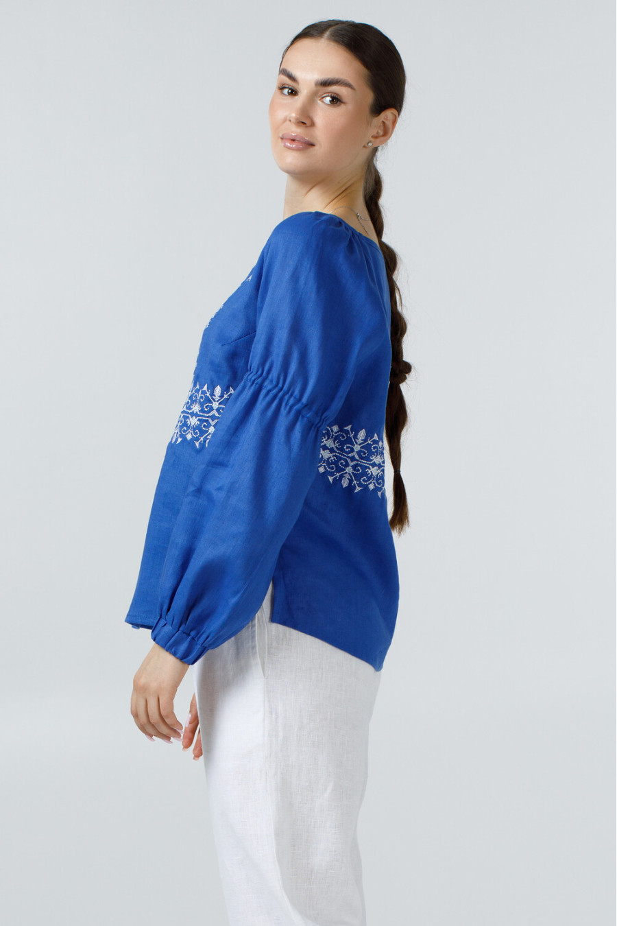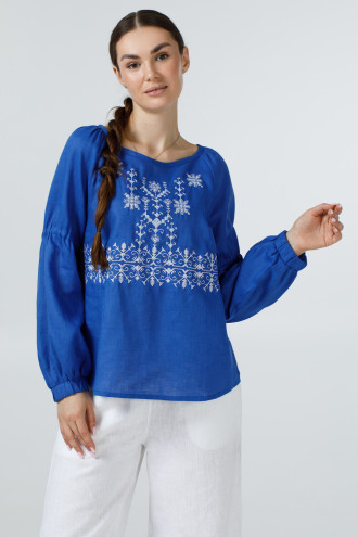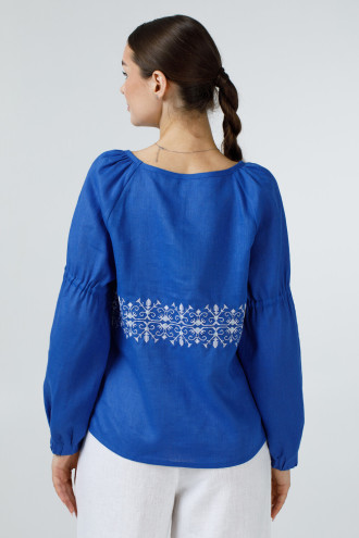 Bright blue charming embroidered blouse made of natural linen with an embroidered ornament-decor, which will add juicy colors to the image. A loose silhouette model with a wide rounded collar, long spacious raglan sleeves with sewn-in elastic bands above the elbows and elastic cuffs, figured indentations on the chest, slits in the side seams. The outfit is decorated with a white geometric ornament with a smooth surface. The embroidery will add lightness and elegance to the girlish image, emphasize the fragility of the forms. The outfit will be appropriate both in the office everyday and in the festive wardrobe.