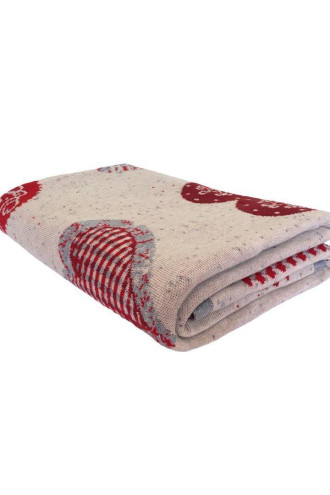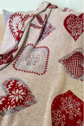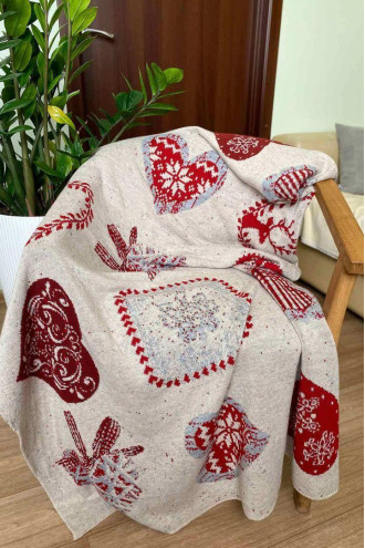 Knitted acrylic plaid in melange-beige color with a pattern in burgundy: hearts, snowflakes and New Year's cards. The plaid will decorate the interior of your home, add festivity and a fairy-tale flavor to it. The product will give a feeling of coziness and provide comfort and warmth to home leisure. It can be a great option for a holiday gift to friends and loved ones.