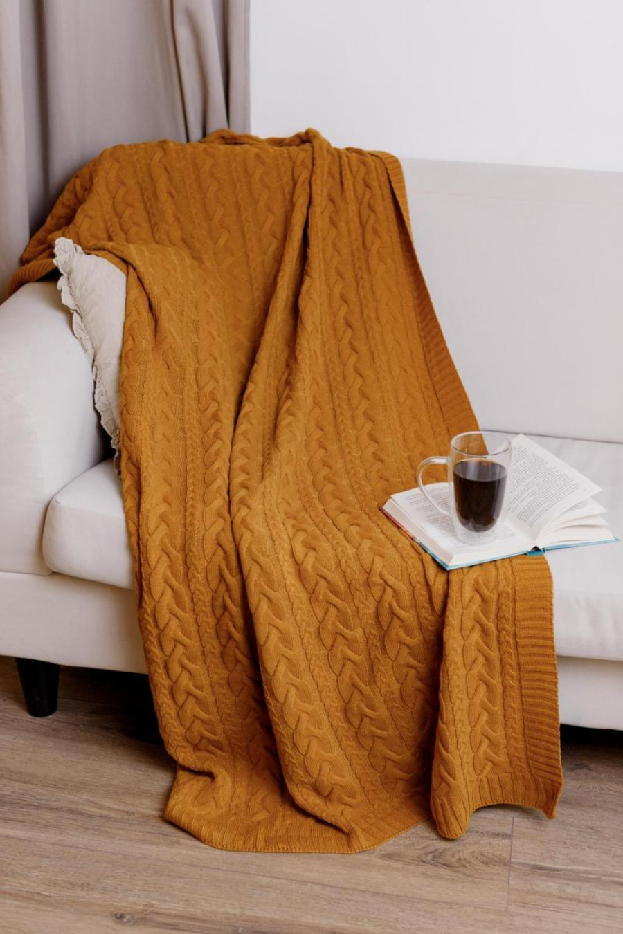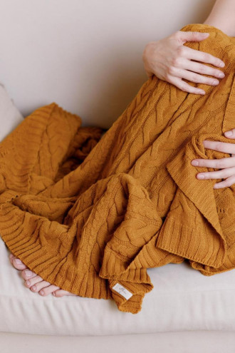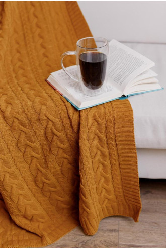 Dark orange warm knitted blanket made of soft acrylic yarn with a voluminous braid pattern, which will add warm sunny colors to the gloomy season. The product will give you a feeling of warmth and comfort in the cold season, will add complete harmony to the home interior. The blanket will be a good gift for a special event or holiday, or simply a "warm souvenir" for cool days.