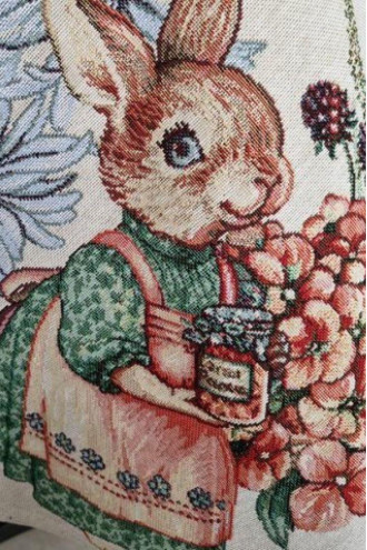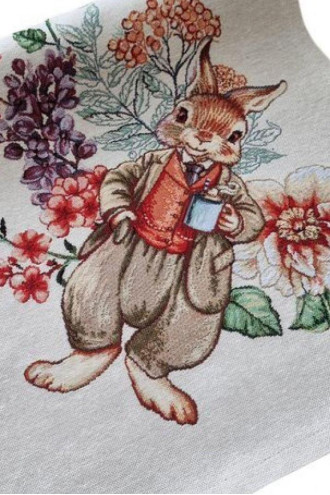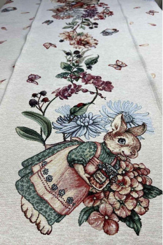 Festive table runner made of cream-beige tapestry fabric with a pattern of a pair of Easter bunnies, colorful flowers and butterflies. The product will be a great holiday gift for any hostess. The runner can be combined with a large festive tablecloth, or laid on the table in the center, diagonally or across it. The product will be appropriate for serving any table and will add family comfort and warmth to the interior.