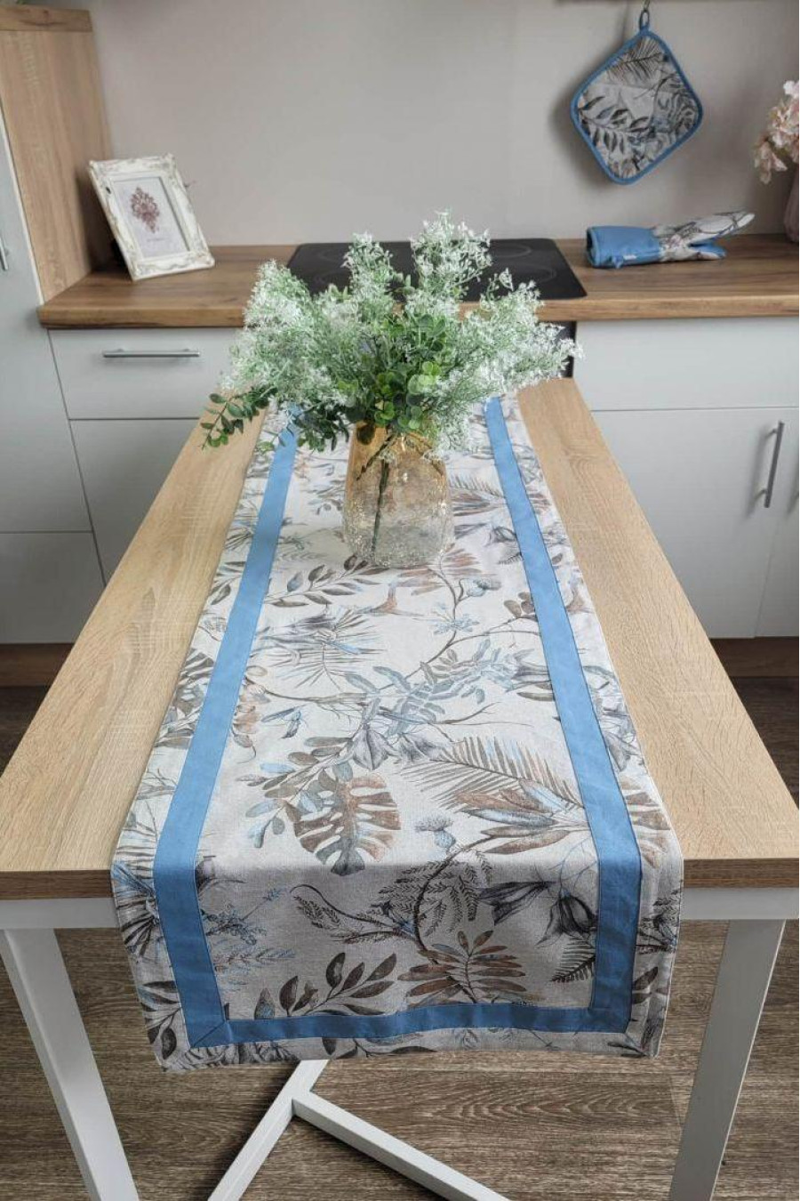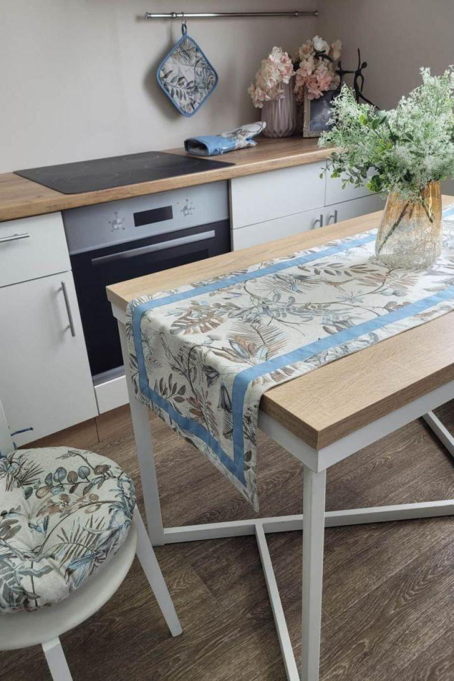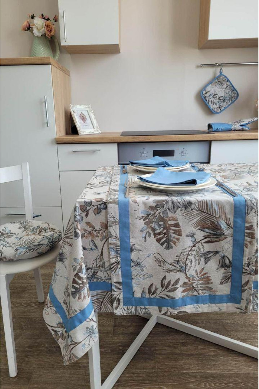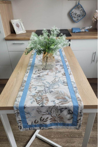 Beige linen festive tablecloth (runner) made of natural cotton fabric with a pattern: floral ornaments in pastel colors and a sky-blue ribbon-edging. The product will be a good gift for any hostess. The runner can be combined with a large festive tablecloth, or laid on the table in the center, diagonally or across it only. The runner will decorate the interior of your home, add charm and originality to it.