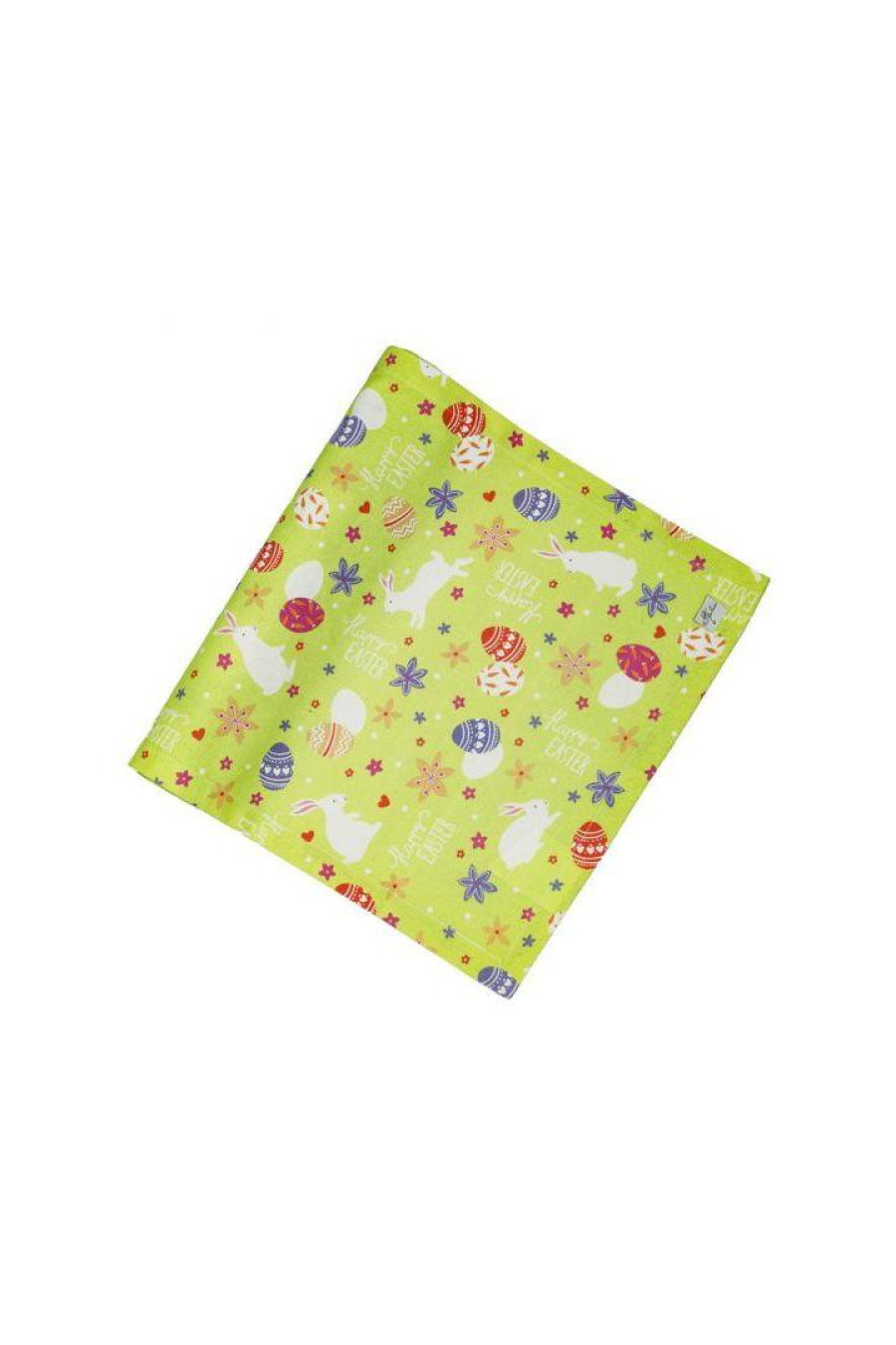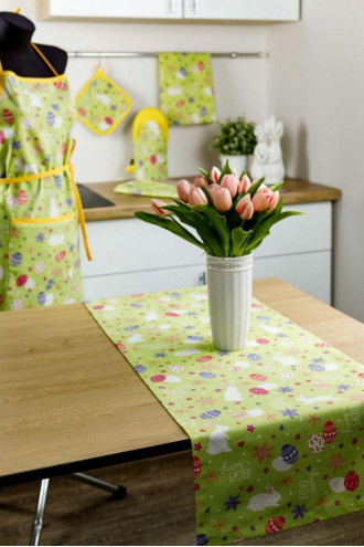 Pistachio-green Easter festive tablecloth (runner) made of natural cotton fabric with a pattern: multi-colored Easter eggs, Easter rabbits and flowers. The product will be a good holiday gift for any hostess. The runner can be combined with a large festive tablecloth, or laid on the table in the center, diagonally or across it only. The product will be appropriate for serving any table and will add family comfort and warmth to the interior.