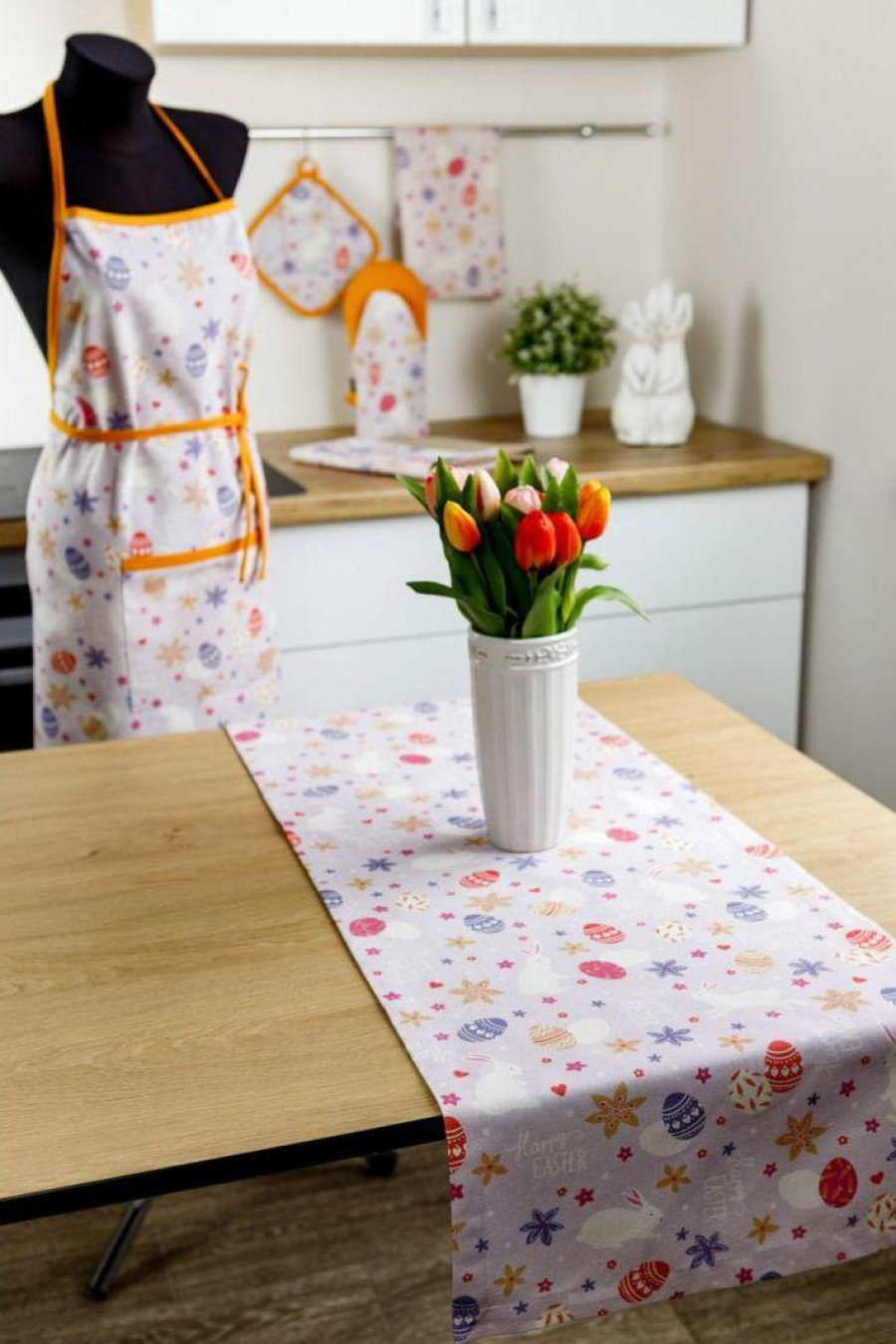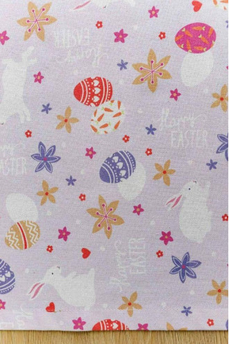 Easter festive tablecloth (runner) made of natural cotton fabric in lilac-lavender color with a pattern: multi-colored Easter eggs, Easter rabbits and flowers. The product will be a good gift for the holiday for any hostess. The runner can be combined with a large festive tablecloth, or spread on the table in the center, diagonally or across it only. The product will be appropriate for serving any table and will add family comfort and warmth to the interior.
