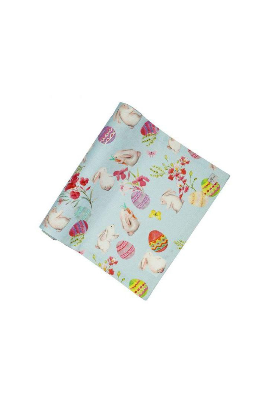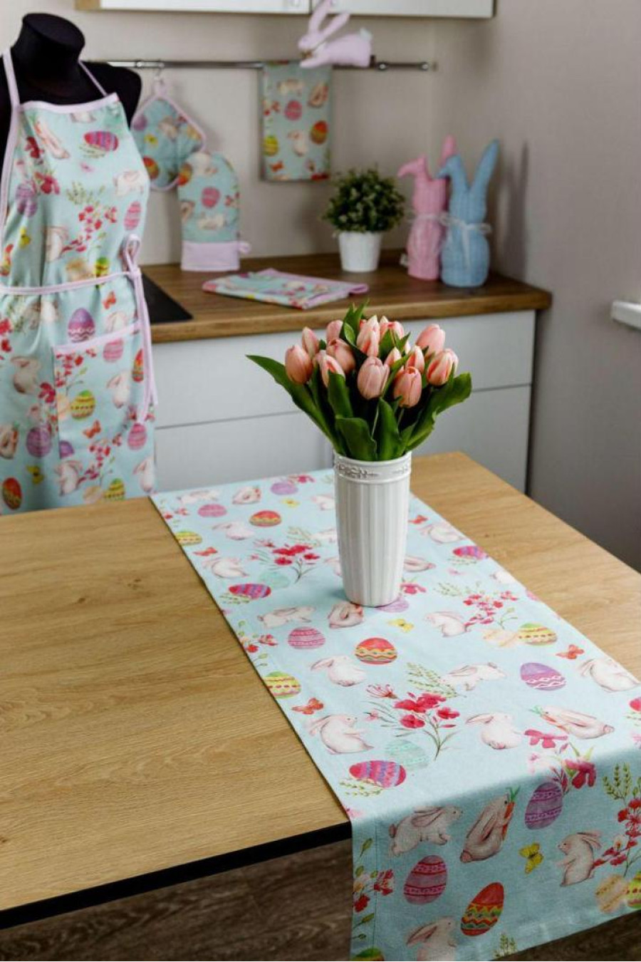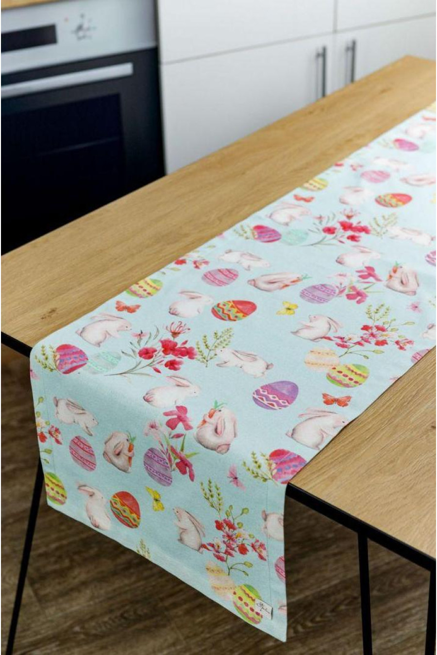 Light blue Easter festive tablecloth (runner) made of natural cotton fabric with a pattern: multi-colored Easter eggs, Easter rabbits and flowers. The product will be a good holiday gift for any hostess. The runner can be combined with a large festive tablecloth, or spread on the table in the center, diagonally or across it only. The product will be appropriate for serving any table and will add family comfort and warmth to the interior.