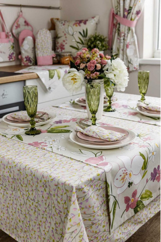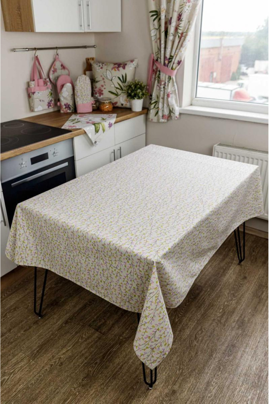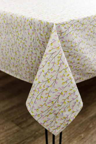 Festive tablecloth for the table made of cotton fabric in cream and milk color with a pattern: willow branches with multi-colored seals. The tablecloth will add elegance and festive color to the interior, is perfect for any feast and goes well with a variety of dishes. The product can be in several size variations and is suitable for both a small table and a large dining table for the whole family. It will be a good holiday gift for your friends and loved ones.