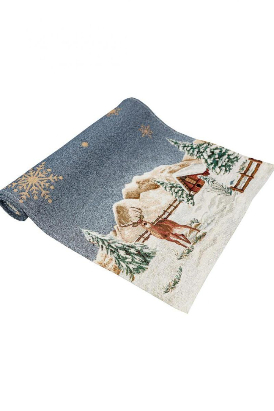 Dark blue festive New Year's tablecloth (runner) made of tapestry fabric with a pastoral landscape pattern: snowy mountains, a wooden house, a deer and openwork snowflakes. The product will be a great gift for any hostess. The runner can be combined with a large tablecloth, or laid on the table in the center, diagonally or across it only. The product will complement the festive setting of your table, add coziness and comfort to your home.