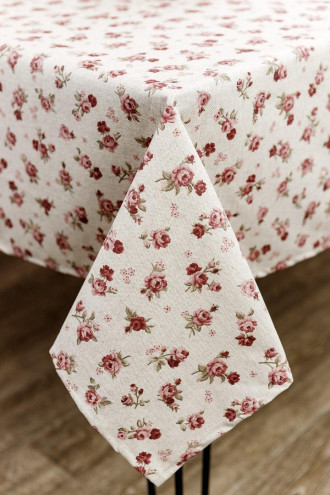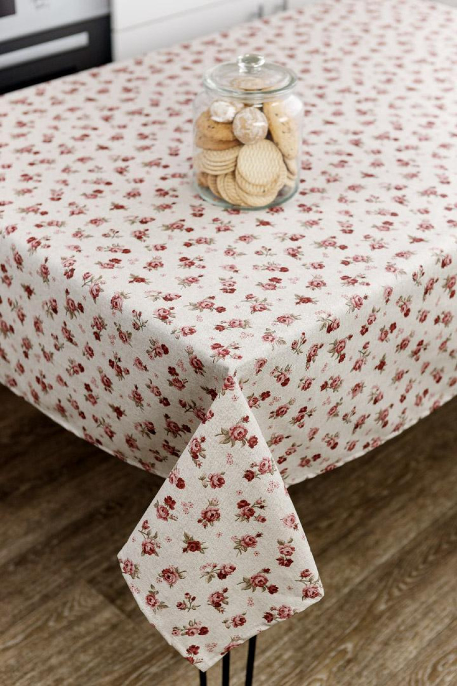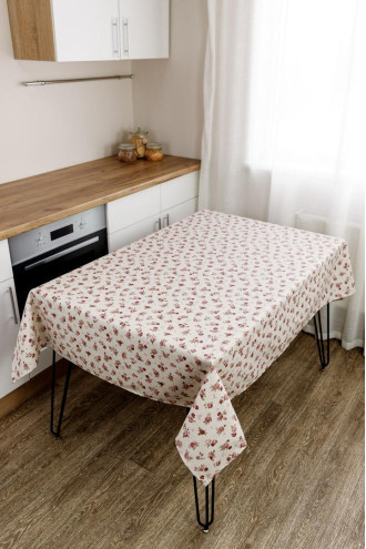Festive tablecloth for the table made of water-repellent cotton fabric in beige-linen color with a rose pattern in burgundy-red and olive tones. The tablecloth will add elegance to the festive interior and goes well with any tableware. The product can be in several size variations and is suitable for both a small table and a large dining table for the whole family. It will be a good holiday gift for your friends and loved ones.