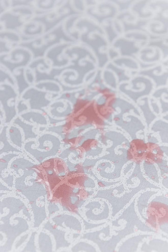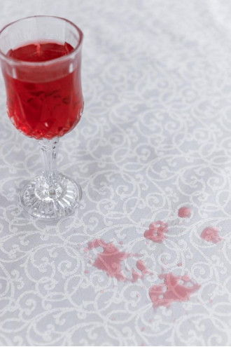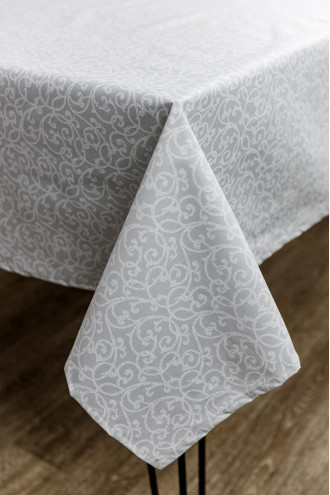 Pearl gray festive tablecloth made of water-repellent cotton fabric with a monogram pattern in white and cream. The tablecloth will add elegance to the festive interior and goes well with any tableware. The product can be in several size variations and is suitable for both a small table and a large dining table for the whole family. It will be a good holiday gift for your friends and loved ones.