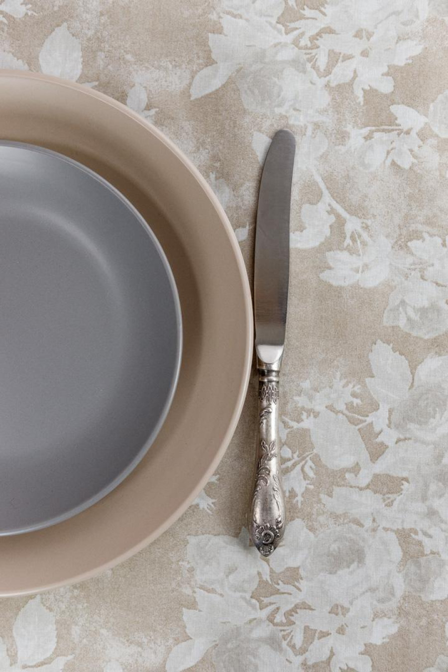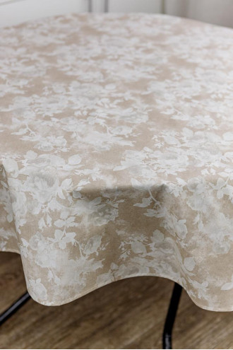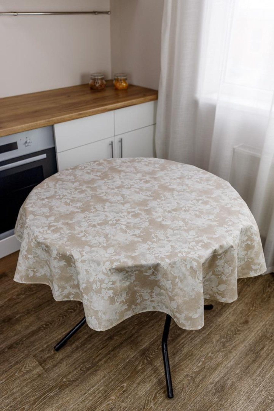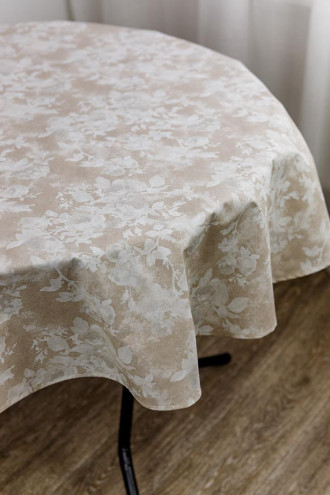 Beige-coffee festive round tablecloth made of water-repellent cotton fabric with an abstract floral pattern in white and cream. The tablecloth will add elegance to the festive interior and goes well with any tableware. The product can be in several size variations and is suitable for both a small table and a large dining table for the whole family. It will be a good holiday gift for your friends and loved ones.