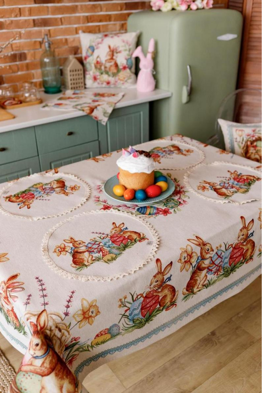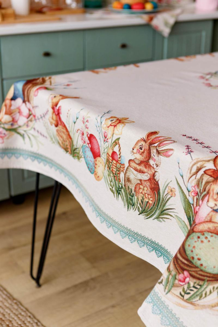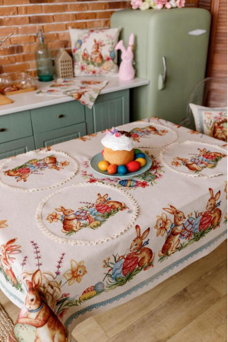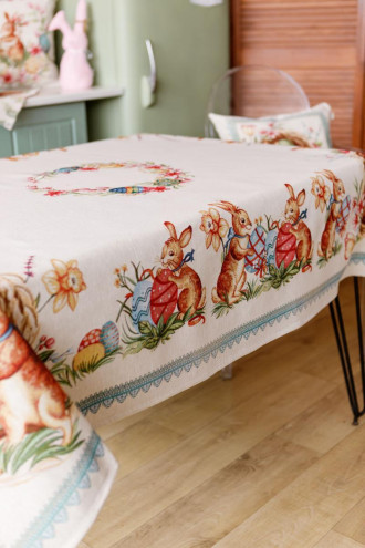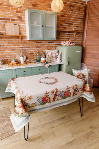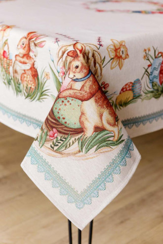 Elegant tapestry tablecloth made of a beige cotton blend fabric with a colorful pattern: Easter bunnies, painted eggs and primroses. The product will decorate the festive table for Easter, add special harmony to the interior, and give a feeling of family comfort. The tablecloth can be in several size variations and is suitable for both a small table and a large dining table for the whole family. It will be a great gift for friends and loved ones.