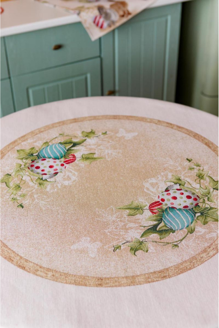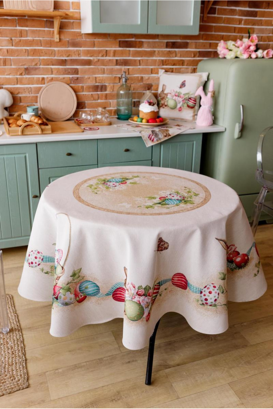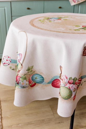 Round festive tablecloth for the table made of tapestry fabric in cream-beige color with a multi-colored pattern-picture: baskets with Easter eggs, checkered ribbons, rabbits, colorful butterflies and flowers. The product will decorate the Easter table, add tenderness and special harmony to the interior, and give a feeling of family comfort. The tablecloth can be in several size variations and is suitable for both a small table and a large dining table for the whole family. It will be a good gift for friends and loved ones.
