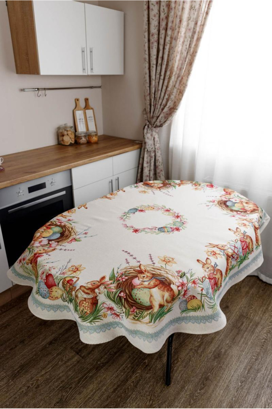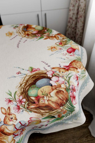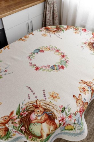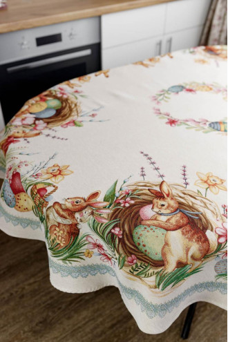 Tapestry oval tablecloth made of a light beige cotton blend fabric with a colorful pattern: Easter bunnies, Easter eggs and primroses. The product will decorate the festive table for Easter, add special harmony to the interior, and give a feeling of family comfort. The tablecloth can be in several size variations and is suitable for both a small table and a large dining table for the whole family. It will be a great gift for friends and loved ones.