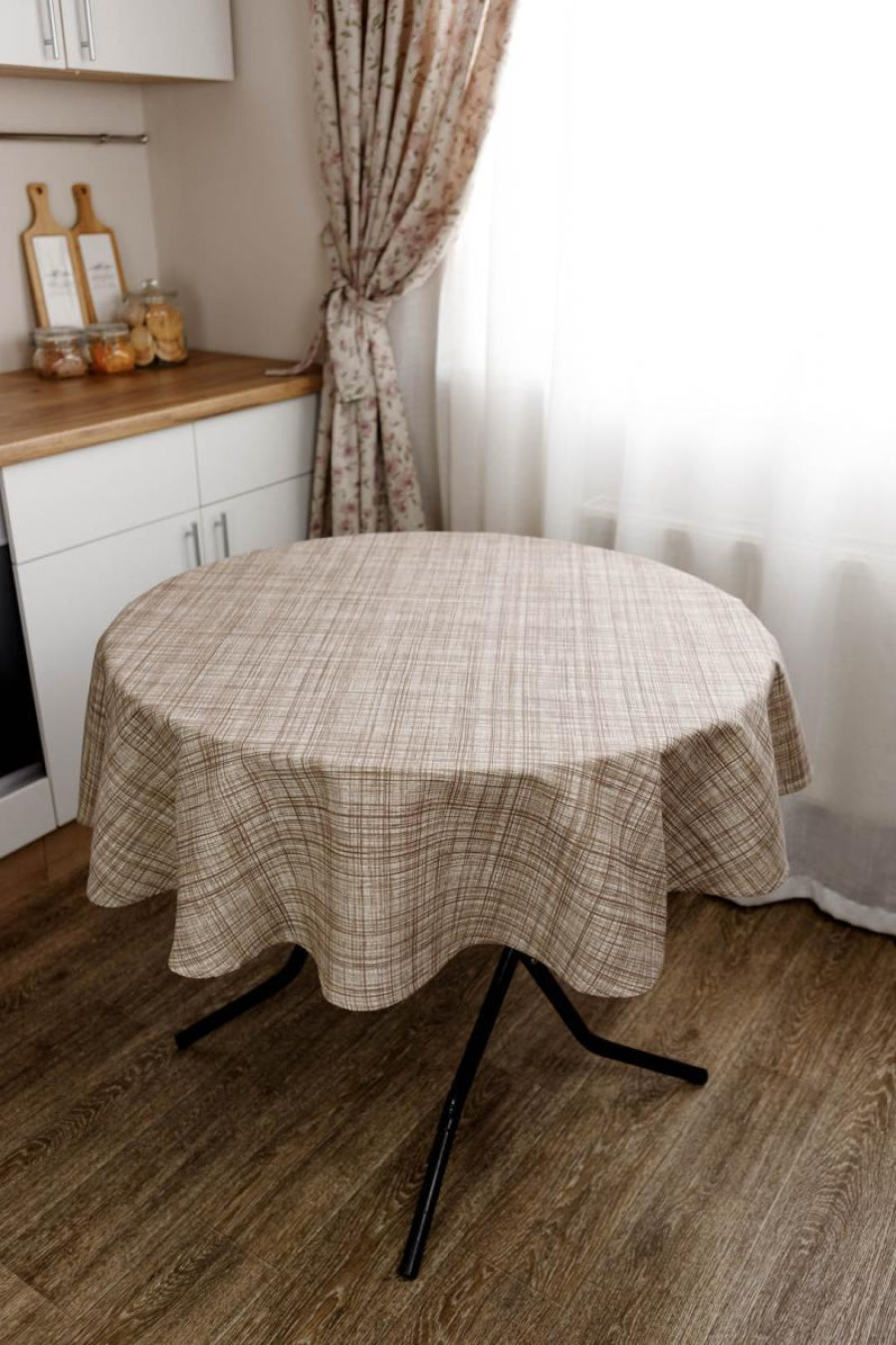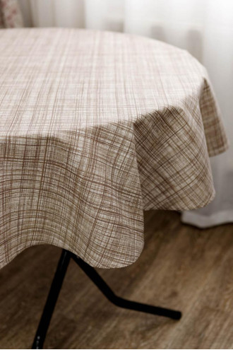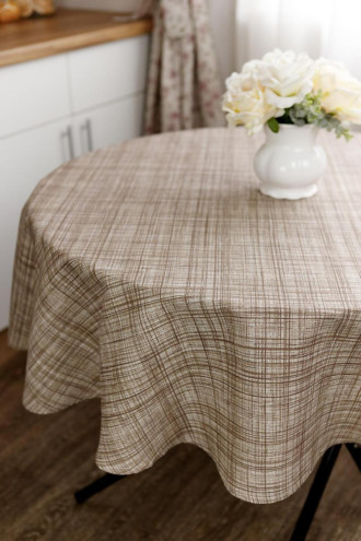 Round checkered festive tablecloth made of beige-brown cotton fabric with a checkered pattern that will decorate your holiday. The tablecloth will add elegance to the festive interior and goes well with any tableware. The product can be in several size variations and is suitable for both a small table and a large dining table for the whole family. It will be a good holiday gift for your friends and loved ones.