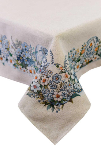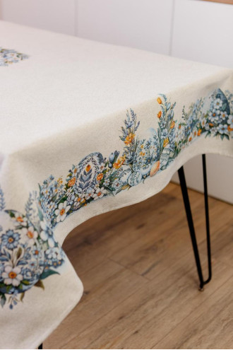 Cream-milk Easter tablecloth for the table made of tapestry fabric with a picture-pattern: Easter eggs with floral motifs and primroses in a blue range. The product will decorate the Easter table, add charm and special harmony to the interior, and give a feeling of comfort. The tablecloth can be in several size variations and is suitable for both a small table and a large dining table for the whole family. It will be a great gift for friends and loved ones.