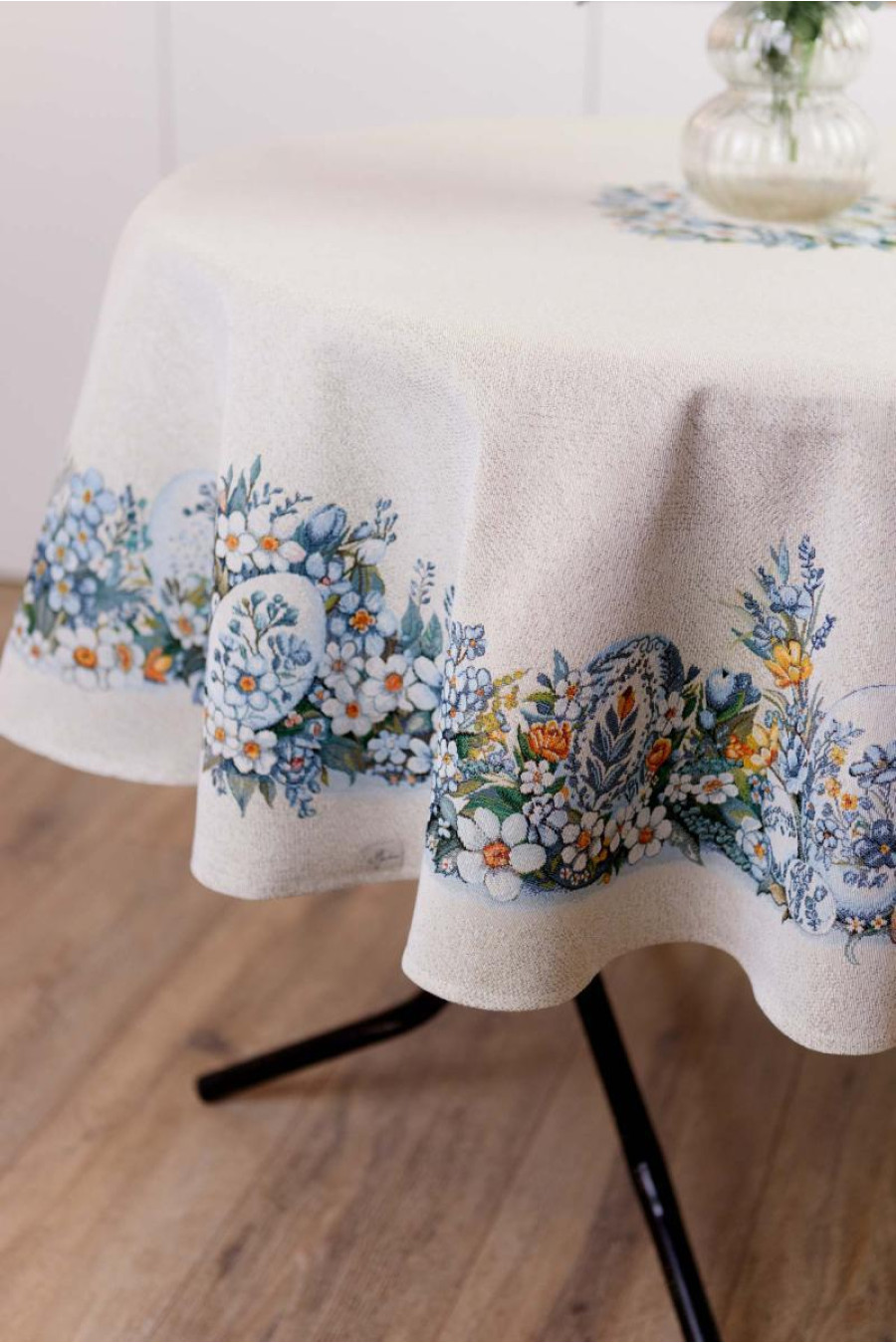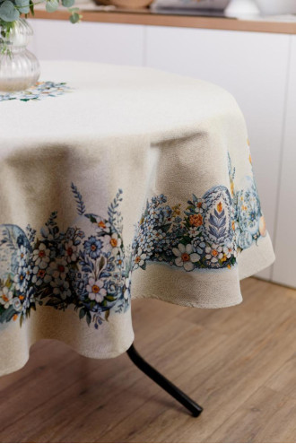 Round Easter tablecloth made of milky-cream tapestry fabric with a picture-like pattern: Easter eggs with floral motifs and primroses in a blue range. The product will decorate the Easter table, add charm and special harmony to the interior, and give a feeling of comfort. The tablecloth can be in several size variations and is suitable for both a small table and a large dining table for the whole family. It will be a great gift for friends and loved ones.