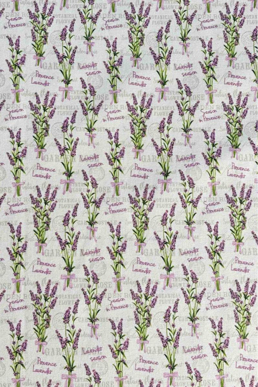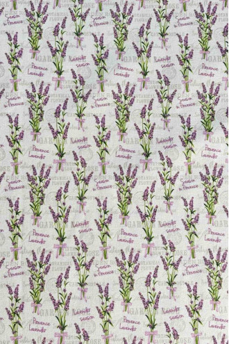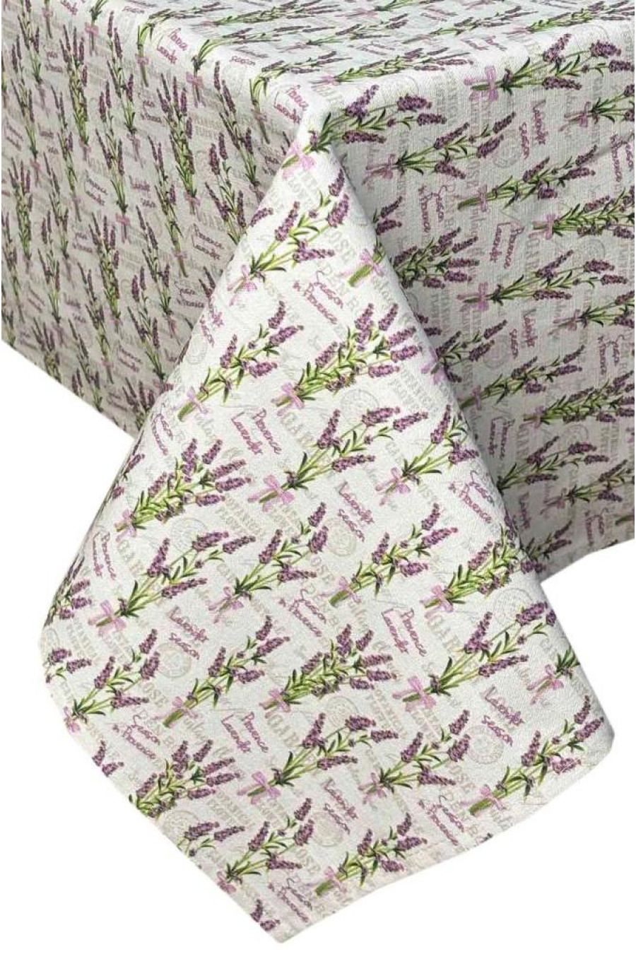 Beige linen tablecloth made of natural cotton fabric with a pattern: lavender bouquets tied with a ribbon and prints-inscriptions, which will decorate the festive table. The tablecloth will successfully complement the interior, give it a charming Provence flora and goes well with any dishes. The product can be in several size variations and is suitable for both a small table and a large dining table for the whole family. It will be a good holiday gift for your friends and loved ones.