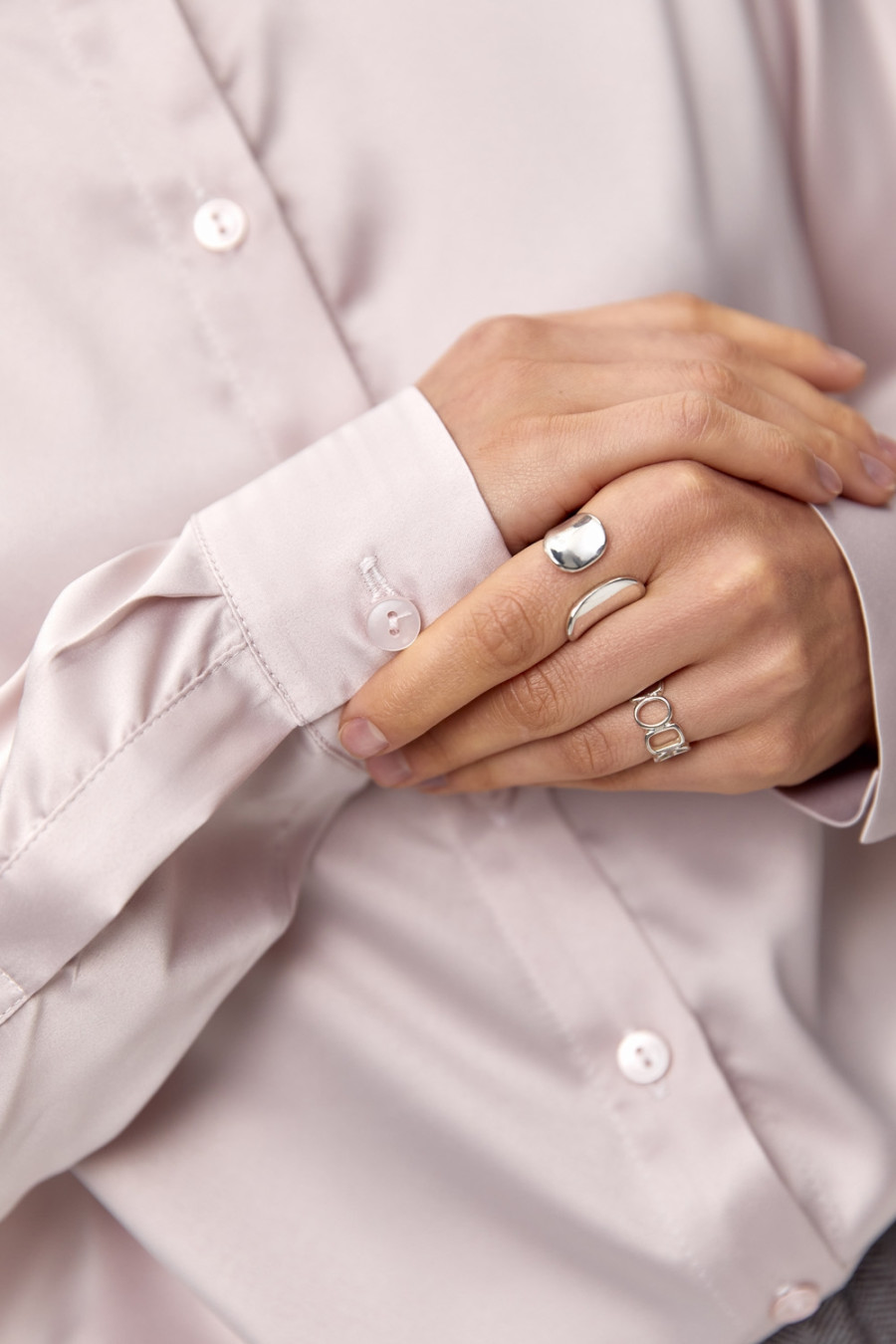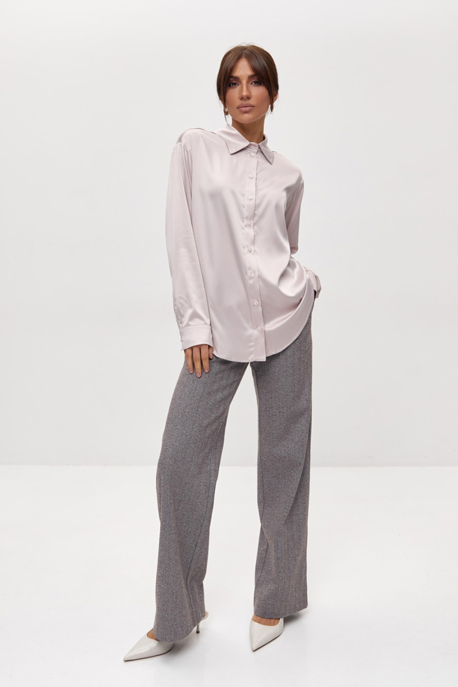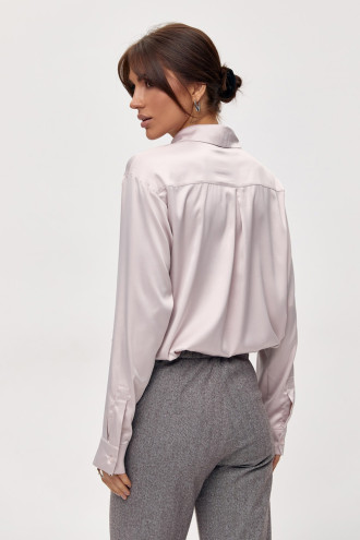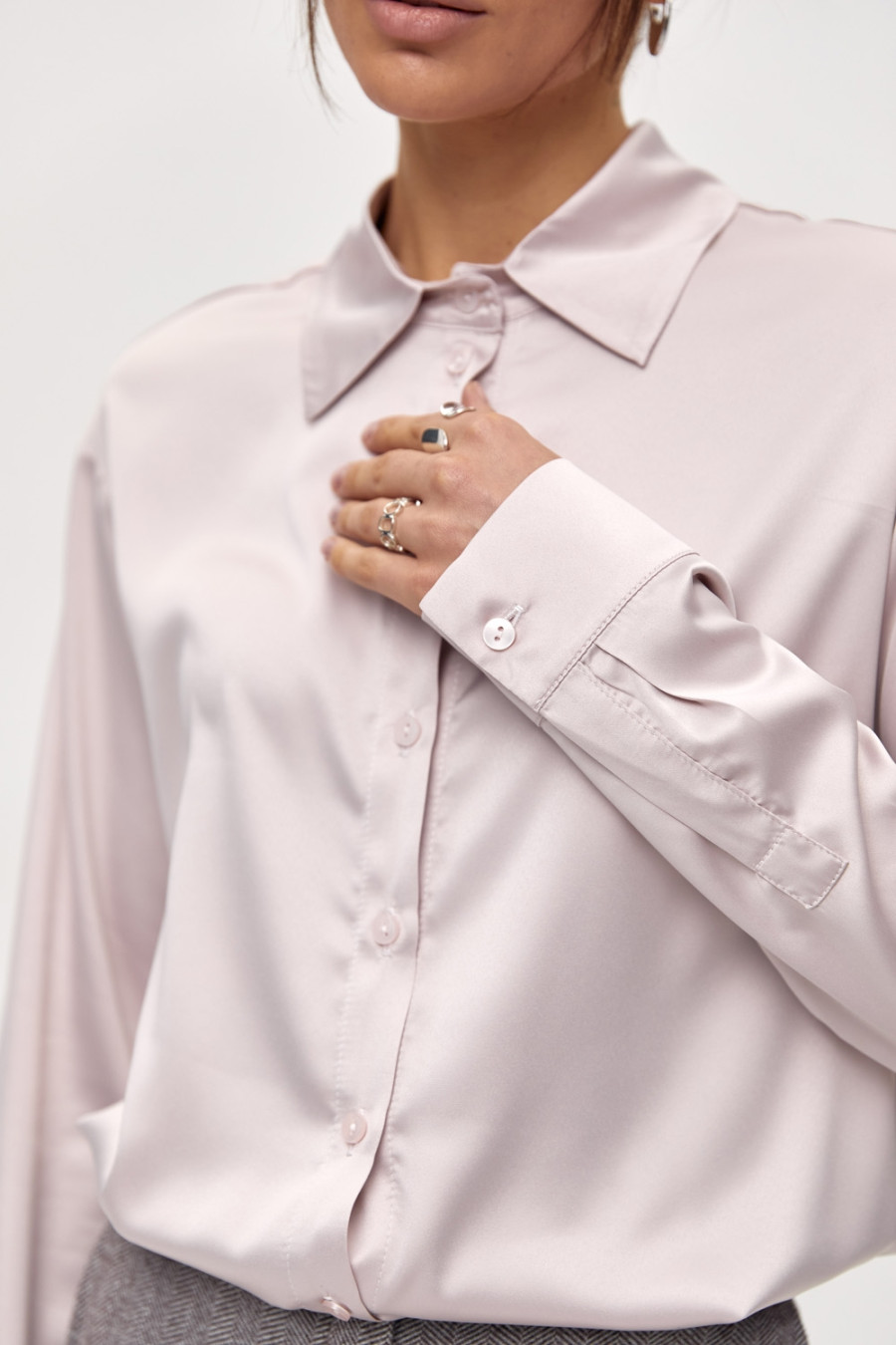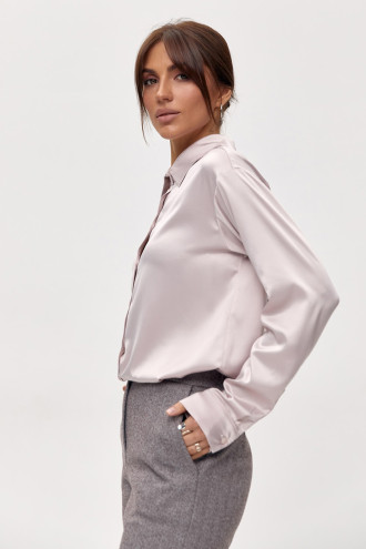 Comfortable shirt made of light airy silk fabric with a delicate matte sheen. Semi-fitted silhouette model with a turn-down collar, spacious sleeves, button fastenings along the length of the product and on the cuffs. Delicate silk fabric gently flows along the silhouette and gives a feeling of lightness for every day. Such a blouse goes well with both business looks and a more casual style.
