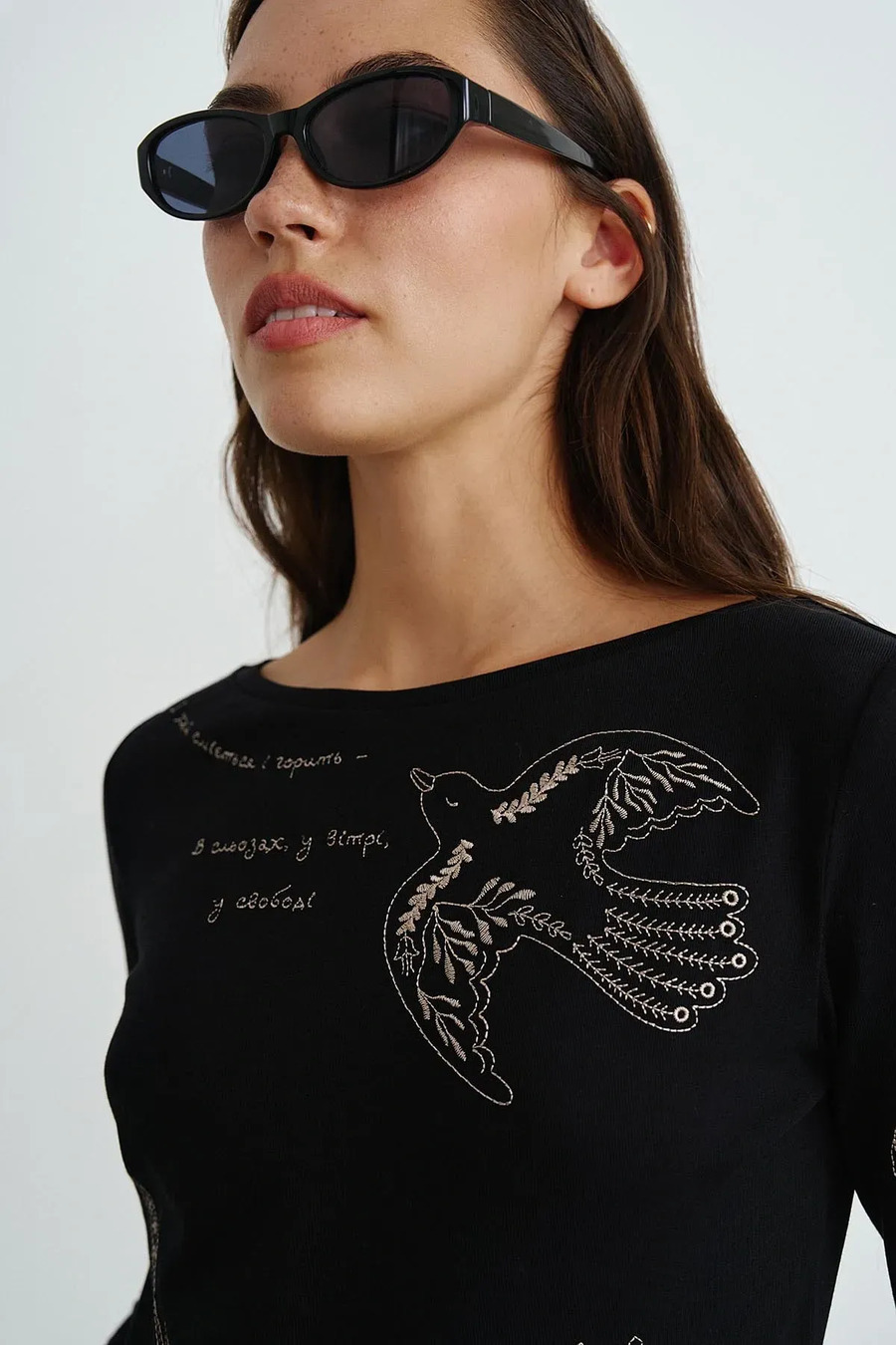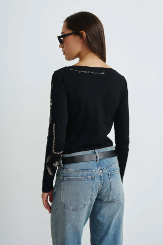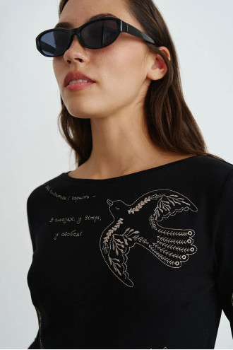 Bodysuit - a universal wardrobe item that combines functionality and comfort. A model with a fitted silhouette, with set-in sleeves, a boat neck and a three-button fastening. Made of high-quality cotton jersey with a cotton content. The product fits snugly to the body, emphasizing the silhouette and providing a neat look in combination with skirts or trousers. Original embroidery adds individuality to the product and emphasizes its aesthetics, making the model more spectacular.