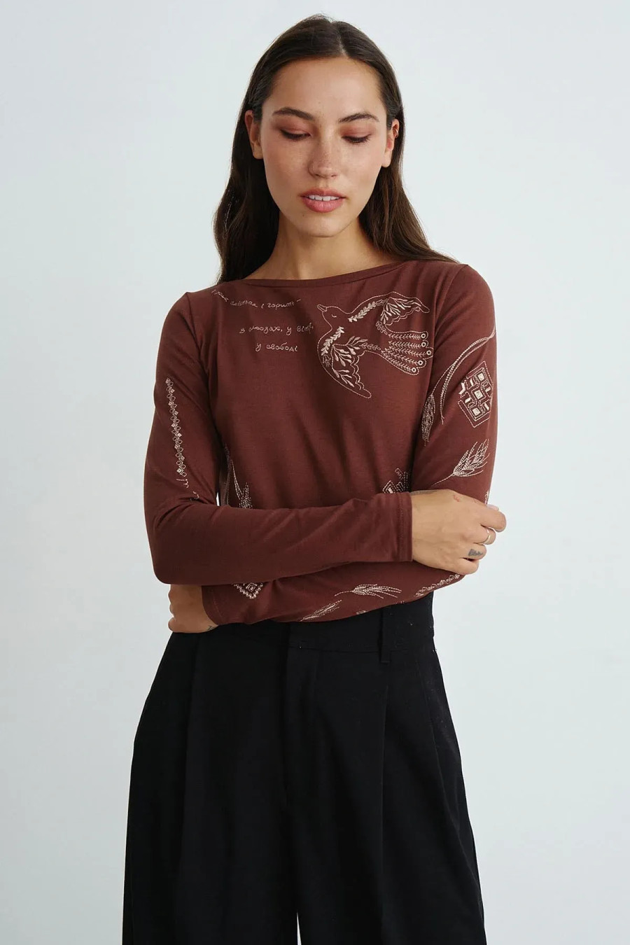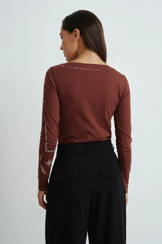 Bodysuit - a universal wardrobe item that combines functionality and comfort. A model with a fitted silhouette, with set-in sleeves, a boat neck and a three-button fastening. Made of high-quality cotton jersey with a cotton content. The product fits snugly to the body, emphasizing the silhouette and providing a neat look in combination with skirts or trousers. Original embroidery adds individuality to the product and emphasizes its aesthetics, making the model more spectacular.