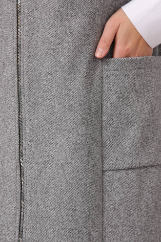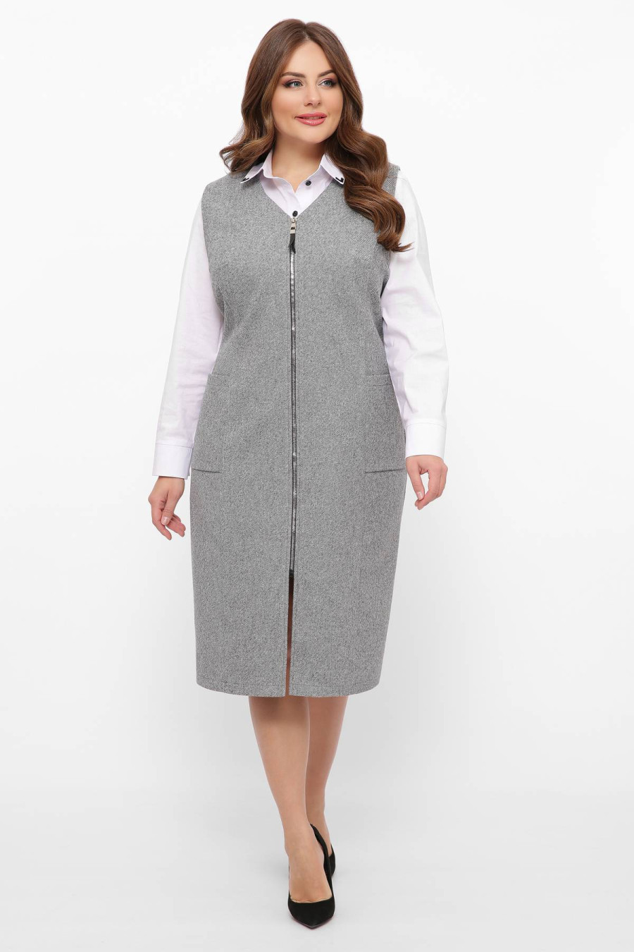 Elegant warm midi demi-season sundress made of half-woolen fabric in gray, which is suitable for both the office and celebrations. A fitted silhouette model with a shallow V-neckline, wide straps, figured seam lines, a zipper on the front, small patch pockets at hip level. The sundress will emphasize the slimness and femininity of the silhouette, add sophistication and charm to the image. The outfit will complement the warm wardrobe of any fashionista.