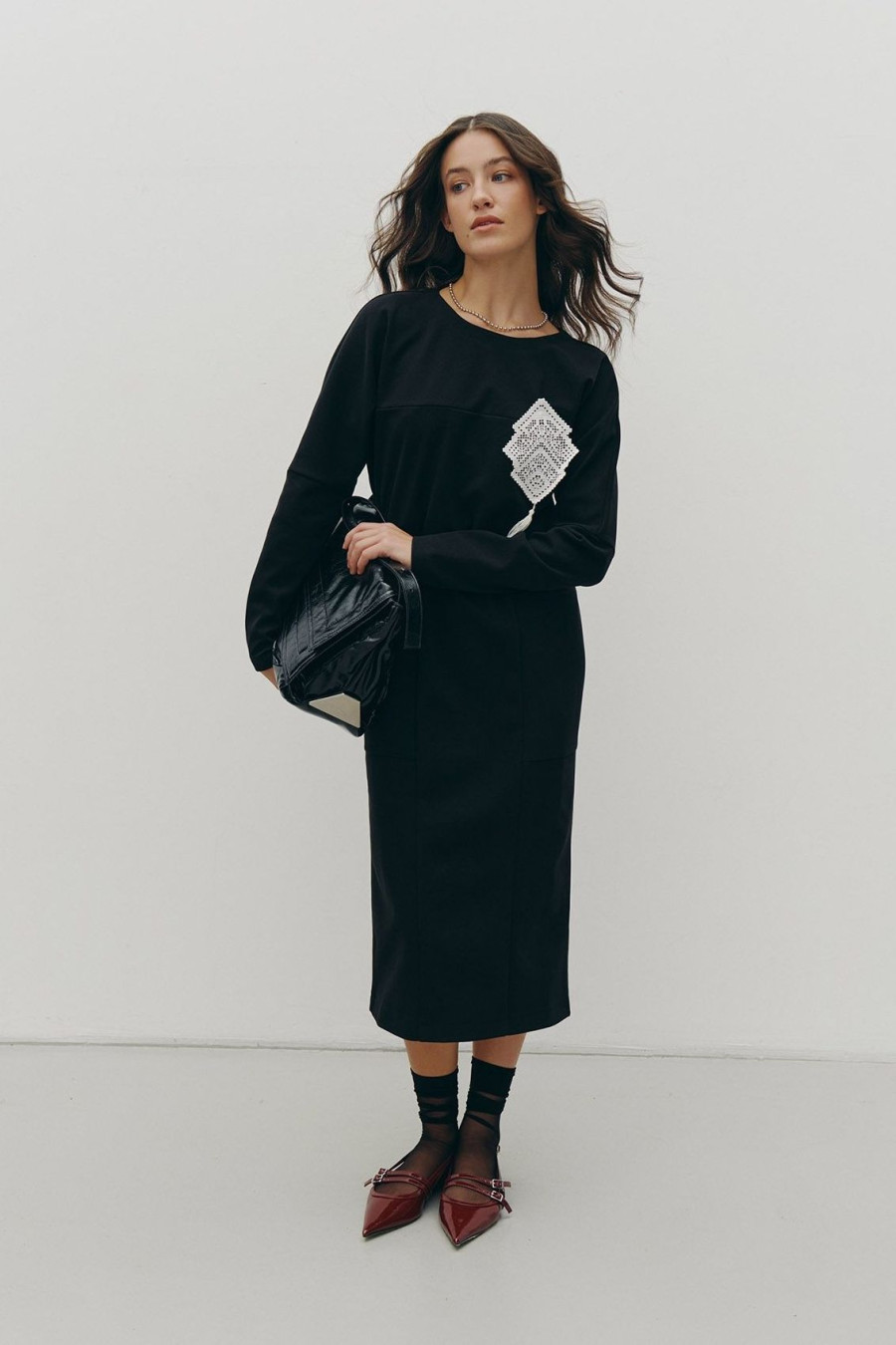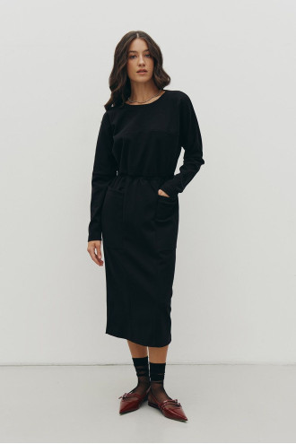 Demi-season black sheath dress made of a mixed viscose knit with wool with a contrasting lace brooch decor with a tassel. A fitted model with a wide boat neck, a V-neck on the back, a cut-out yoke, a dropped shoulder line, long spacious sleeves without cuffs, a sewn-in elastic at the waist, patch pockets at hip level, a deep slit at the back. The dress will emphasize the smoothness and fragility of the curves, add style and charm to the image. The outfit will decorate the wardrobe of any fashionista and goes well with a variety of accessories.
