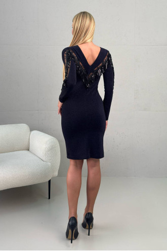 An elegant knitted dress with a fitted silhouette is designed to emphasize the figure and provide comfort throughout the day. The model is made of elastic fabric, which has a noble shine thanks to lurex and gives the image a festive look. The highlight of the design is the accent inserts of transparent mesh on the sleeves and back and sequin decor. The V-neckline on the back adds special charm and femininity. An ideal choice for evening outings, holidays, corporate parties or romantic evenings.
