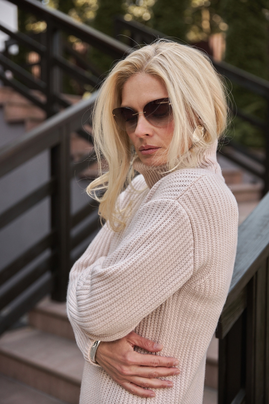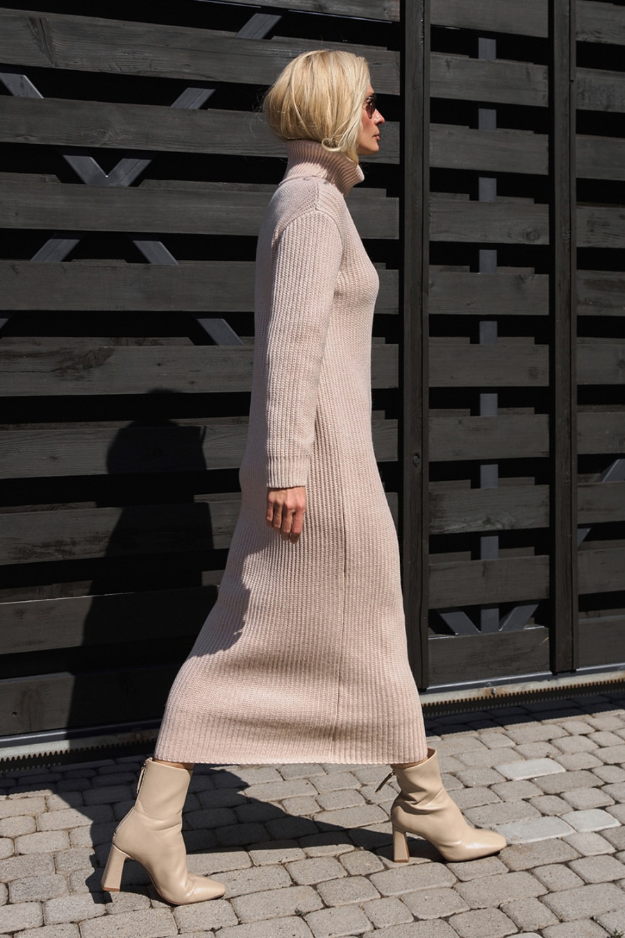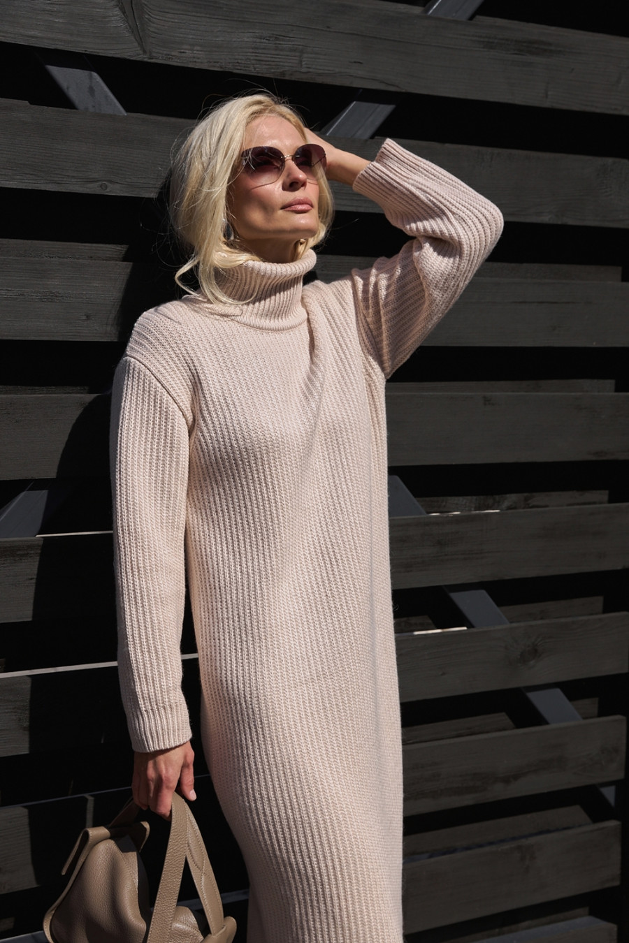 Comfortable long dress made of pearl-colored half-wool yarn, which will be appropriate in the cold season. A loose silhouette model with an elegant collar-clamp, a lowered shoulder line. The body-pleasing dense knit holds its shape well. The dress will add femininity and sophistication to the image.